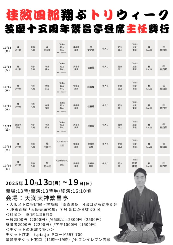 「1週間トリをとらせていただくという重責を感じつつ、しっかりとネタの準備をしています。私が入門したのは繁昌亭ができた後でしたので、入門した頃にまだご存命だった師匠方の高座を思い出したりしています」