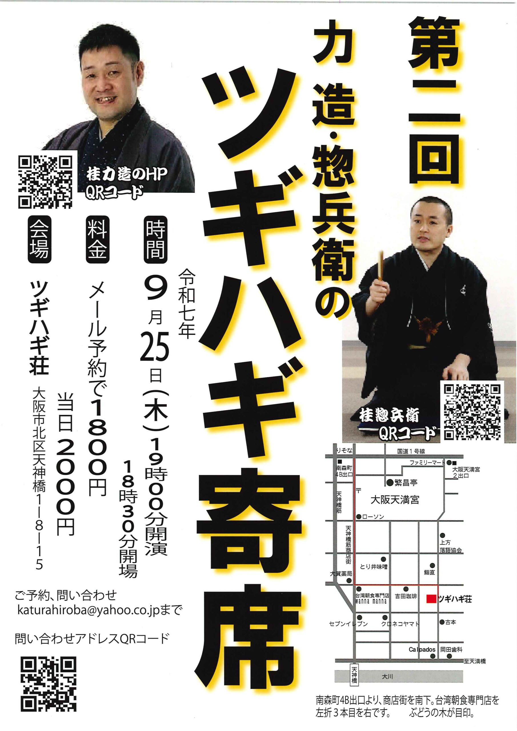 第二回 力造・惣兵衛のツギハギ寄席 桂惣兵衛桂力造 access_time 2025.09.25 シェア 送る ツイート 公演概要 公演日時 2025年9月25日(木)19時開演(18時30分開場) 場所 ツギハギ荘(大阪市北区天神橋1-8-15) ♢「南森町」48番出口より、商店街を南下。 台湾朝食専門店を左折3本目を右。ぶどうの木が目印。 出演者 桂 力造 桂 惣兵衛 料金 予約 1,800 円 当日 2,000 円 お問い合わせ Mail katurahiroba@yahoo.co.jp « 前へ一覧へ 次へ » 直近の落語会情報 2025年12月10日 こんばんは寄席 桂枝之進 2025年12月10日 天使・秀都 姉弟らくご会 ほしがり天都の十二月 林家染吉月亭秀都月亭天使 2025年12月10日 第91回「新世紀落語の会」 桂春之輔桂米紫桂福枝桂三歩