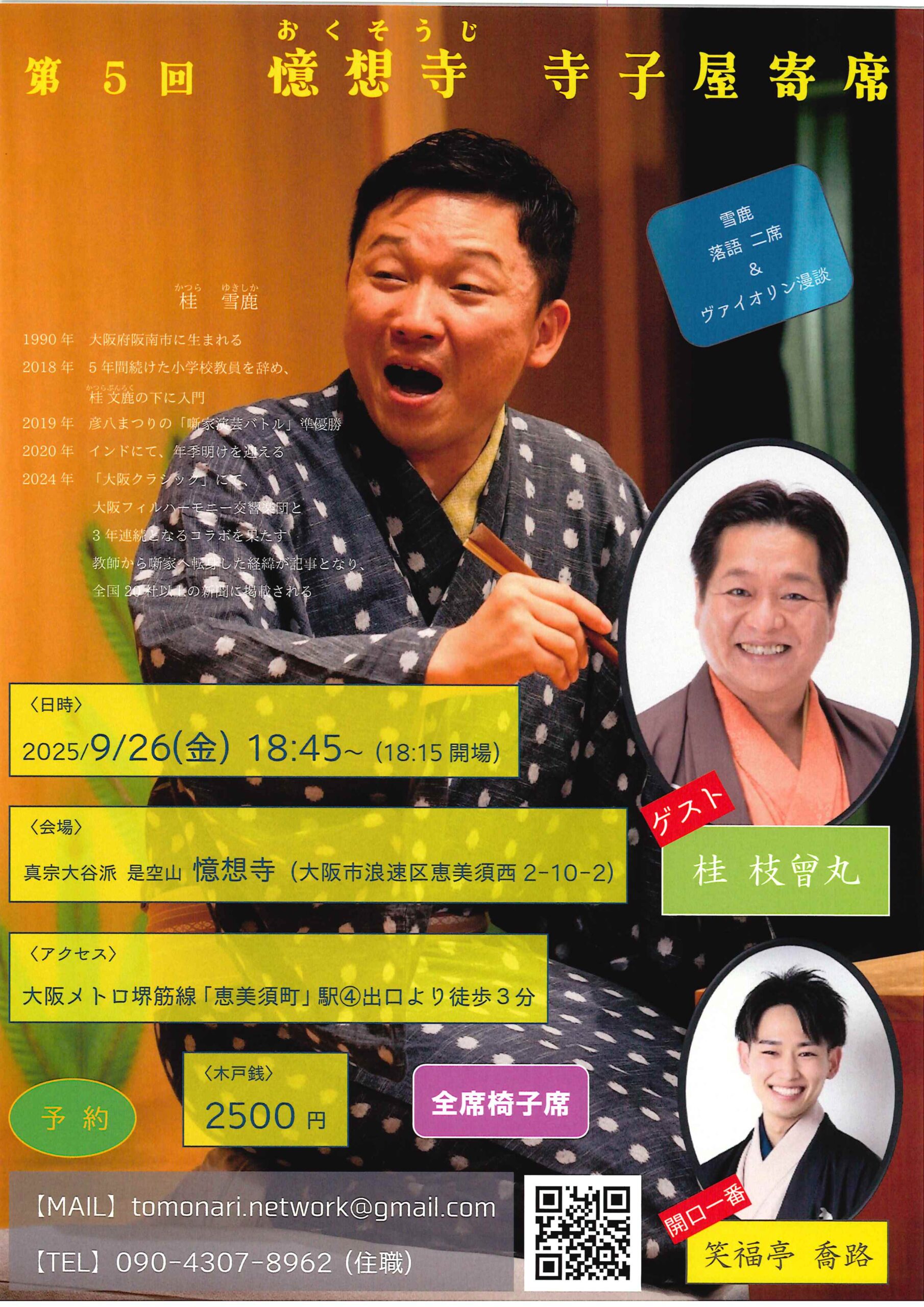 第5回 憶想寺 寺子屋寄席 桂枝曾丸桂雪鹿笑福亭喬路 access_time 2025.09.26 シェア 送る ツイート 公演概要 公演日時 2025年9月26日(金)18時45分開演(18時15分開場) 場所 真宗大谷派 是空山 憶想寺(大阪市浪速区恵比寿西2-10-2) 出演者 桂 雪鹿 笑福亭 喬路 ゲスト:桂 枝曾丸 料金 木戸銭 2,500 円 お問い合わせ Tel 090-4307-8962 Mail tomonari.network@gmail.com « 前へ一覧へ 次へ » 直近の落語会情報 2025年12月10日 こんばんは寄席 桂枝之進 2025年12月10日 天使・秀都 姉弟らくご会 ほしがり天都の十二月 月亭秀都月亭天使林家染吉 2025年12月10日 第91回「新世紀落語の会」 桂米紫桂福枝桂三歩桂春之輔