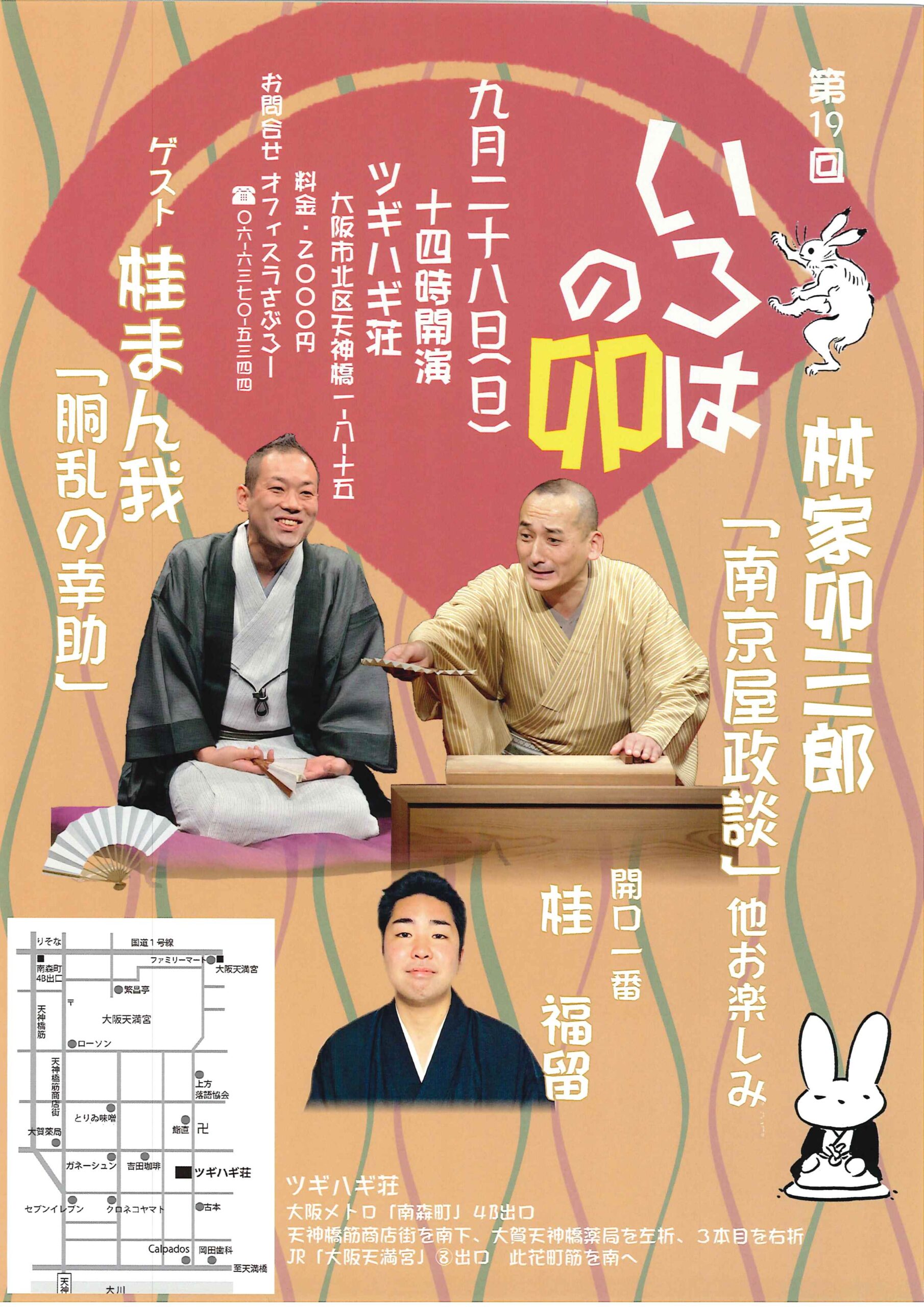 第19回 いろはの卯 access_time 2025.09.28 シェア 送る ツイート 公演概要 公演日時 2025年9月28日(日)14時開演 場所 ツギハギ荘(大阪市北区天神橋1-8-15) ♢大阪メトロ「南森町」4B出口 天神橋筋商店街を南下、大阪天神橋薬局を左折、3本目を右折 ♢JR「大阪天満宮」⑧出口 此花町筋を南へ 出演者 林家 卯三郎 「南京屋政談」他お楽しみ ゲスト:桂 まん我 「胴乱の幸助」 桂 福留 開口一番 料金 料金 2,000 円 お問い合わせ Tel 06-6370-5344(オフィスうさぶろー) « 前へ一覧へ 次へ » 直近の落語会情報 2025年12月10日 こんばんは寄席 桂枝之進 2025年12月10日 天使・秀都 姉弟らくご会 ほしがり天都の十二月 林家染吉月亭秀都月亭天使 2025年12月10日 第91回「新世紀落語の会」 桂米紫桂福枝桂三歩桂春之輔