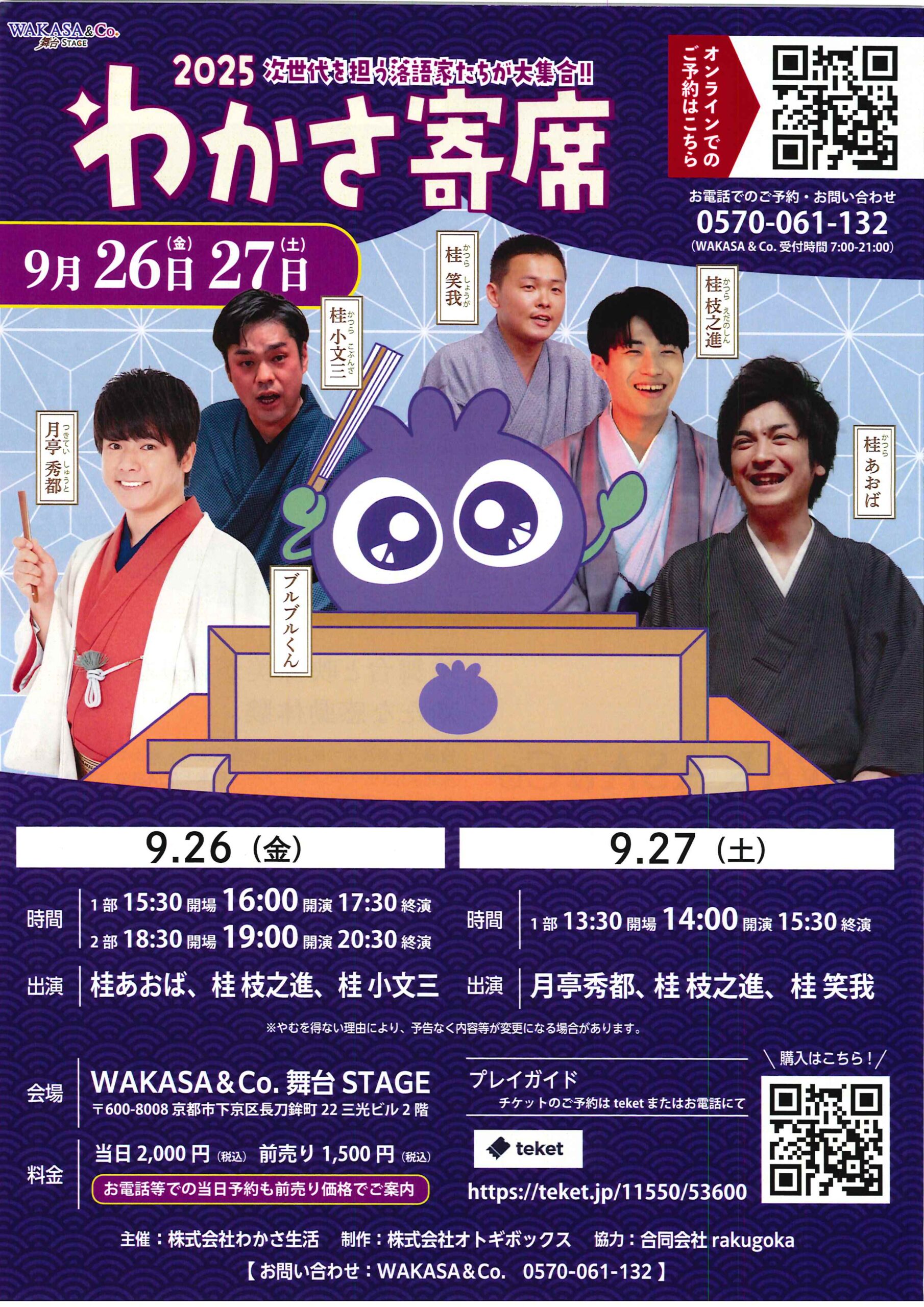 わかさ寄席 桂あおば桂枝之進桂小文三 access_time 2025.09.26 シェア 送る ツイート 公演概要 公演日時 2025年9月26日(金)1部:16時開演(15時30分開場) 2部:19時開演(18時30分開場) 場所 WAKASA&Co. 舞台STAGE(京都市下京区長刀鉾町22 三光ビル2階) 出演者 桂 あおば 桂 枝之進 桂 小文三 料金 前売 1,500 円 当日 2,000 円 お問い合わせ Tel 0570-061-132(WAKASA&Co.) https://teket.jp/11550/53600 « 前へ一覧へ 次へ » 直近の落語会情報 2025年12月10日 こんばんは寄席 桂枝之進 2025年12月10日 天使・秀都 姉弟らくご会 ほしがり天都の十二月 林家染吉月亭秀都月亭天使 2025年12月10日 第91回「新世紀落語の会」 桂米紫桂福枝桂三歩桂春之輔