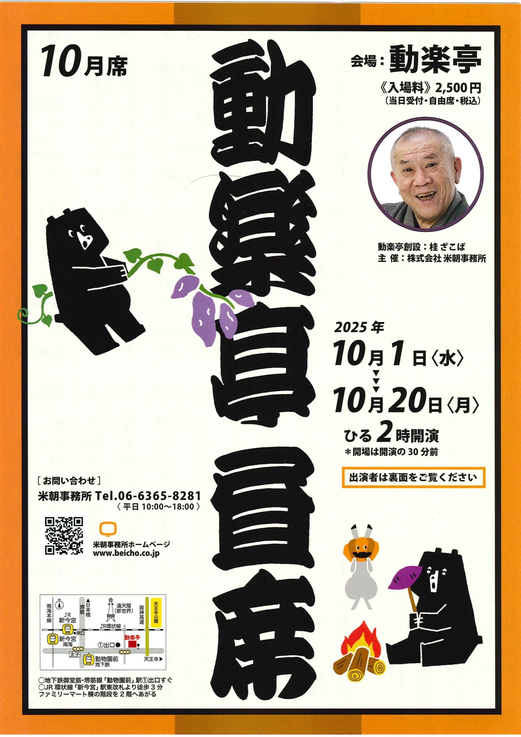 動楽亭 昼席 10月席 笑福亭風喬桂吉の丞桂団朝桂治門桂九寿玉 access_time 2025.10.20 シェア 送る ツイート 公演概要 公演日時 2025年10月20日(月)14時開演(13時30分開場) 場所 動楽亭(大阪市西成区山王1丁目17-6) ♢地下鉄御堂筋線/堺筋線「動物園前」駅①出口すぐ ♢JR「新今宮」駅 東口改札より徒歩3分 ファミリーマート横の階段から2階へあがる 出演者 桂 九寿玉 桂 治門 笑福亭 風喬 桂 南天 ―中入― 桂 吉の丞 桂 団朝 料金 2,500円 (当日受付・自由席) お問い合わせ 米朝事務所 ℡ 06-6365-8281(平日10時~18時) « 前へ一覧へ 次へ » 直近の落語会情報 2025年10月09日 あべのハルカス寄席 十月席 林家染吉桂阿か枝桂雀太露の紫桂九ノ一 2025年10月09日 動楽亭 昼席 10月席 桂米紫桂米平桂千朝桂慶治朗桂八十助桂歌之助 2025年10月10日 第28回 希遊の毎月ネタ下ろしの会in猫も杓子も 月亭希遊