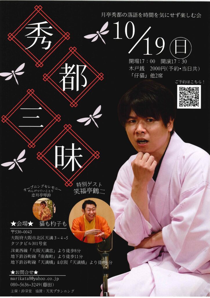 秀都三昧 笑福亭鶴二月亭秀都 access_time 2025.10.19 シェア 送る ツイート 公演概要 公演日時 10月19日(日)17時30分開演(17時開場) 場所 猫も杓子も(大阪市北区天満3-4-5タツタビル301号室) ♢JR東西線「大阪天満宮」より徒歩8分 ♢地下鉄谷町線「南森町」より徒歩11分 ♢地下鉄谷町線・京阪「天満橋」より徒歩6分 出演者 月亭 秀都 特別ゲスト:笑福亭 鶴二 オープニングセレモニー:恋月亭 琴鈴 料金 予約・当日共 2,000 円 お問い合わせ Tel 080-5636-3249(藤田) Mail marikata8@yahoo.co.jp « 前へ一覧へ 次へ » 直近の落語会情報 2025年10月14日 動楽亭 昼席 10月席 林家染雀桂弥壱桂文華桂塩鯛桂米団治桂米輝 2025年10月14日 あべのハルカス寄席 十月席 桂かい枝笑福亭生喬笑福亭笑利桂枝曾丸露の新治桂雪鹿 2025年10月15日 雀五郎・天使ふたり会 桂雀五郎月亭天使
