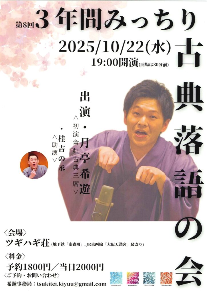 第8回 3年間みっちり古典落語の会 桂吉の丞月亭希遊 access_time 2025.10.22 シェア 送る ツイート 公演概要 公演日時 2025年10月22日(水)19時開演(18時30分開場) 場所 ツギハギ荘 ♢地下鉄「南森町」・JR東西線「大阪天満宮」最寄り 出演者 月亭 希遊 助演:桂 吉の丞 料金 予約 1,800 円 当日 2,000 円 お問い合わせ Mail tsukitei.kiyuu@gmail.com « 前へ一覧へ 次へ » 直近の落語会情報 2025年10月10日 第28回 希遊の毎月ネタ下ろしの会in猫も杓子も 月亭希遊 2025年10月10日 動楽亭 昼席 10月席 桂雀三郎桂よね吉桂千朝桂小鯛桂佐ん吉 2025年10月11日 第二百十四回 落語みゅーじあむ寄席 桂米之助桂福枝月亭希遊