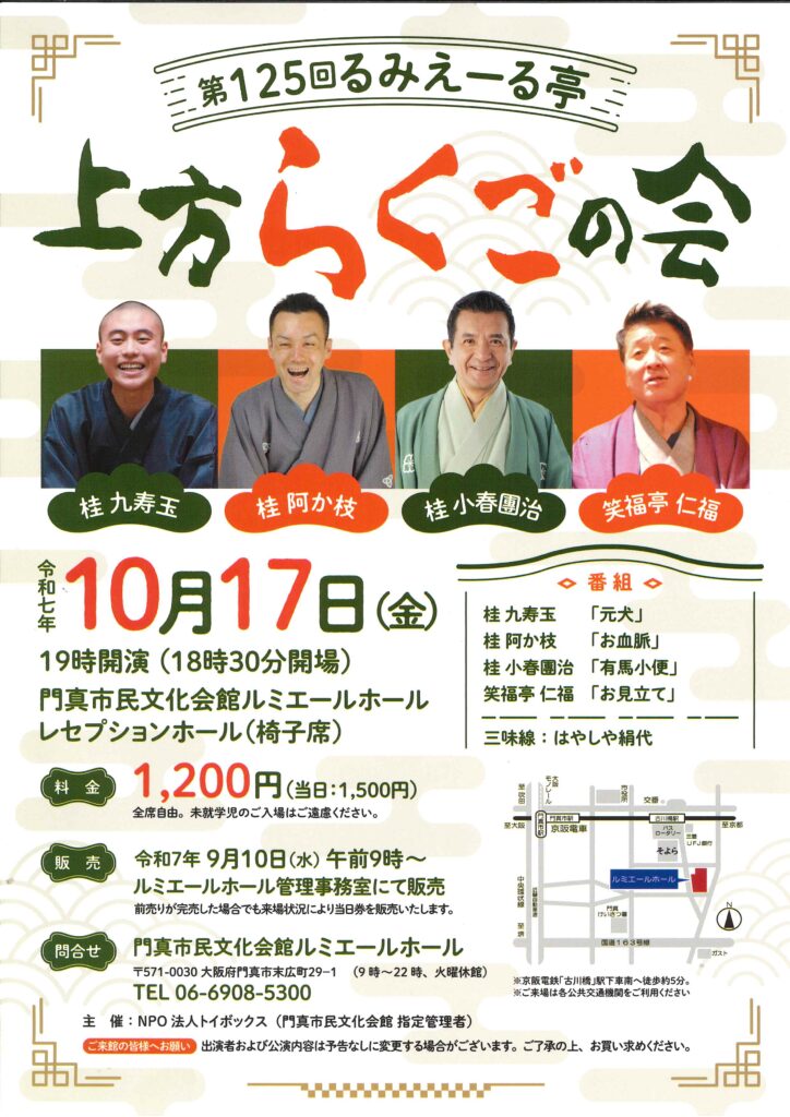 第125回 るみえーる亭 上方らくごの会 笑福亭仁福はやしや絹代桂九寿玉桂阿か枝桂小春団治 access_time 2025.10.17 シェア 送る ツイート 公演概要 公演日時 2025年10月17日(金)19時開演(18時30分開場) 場所 門真市民文化会館ルミエールホール2階レセプションホール ♢京阪電鉄「古川橋」駅下車 南へ徒歩約5分 出演者 桂 九寿玉 「元犬」 桂 阿か枝 「お血脈」 桂 小春団治 「有馬小便」 笑福亭 仁福 「お見立て」 三味線:はやしや 絹代 料金 前売 1,200 円 当日 1,500 円 お問い合わせ Tel 06-6908-5300(門真市民文化会館ルミエールホール) « 前へ一覧へ 次へ » 直近の落語会情報 2025年10月15日 雀五郎・天使ふたり会 桂雀五郎月亭天使 2025年10月15日 こんばんは寄席 桂枝之進 2025年10月16日 動楽亭 昼席 10月席 桂 文華桂弥っこ桂二乗桂慶治朗桂米之助林家染雀