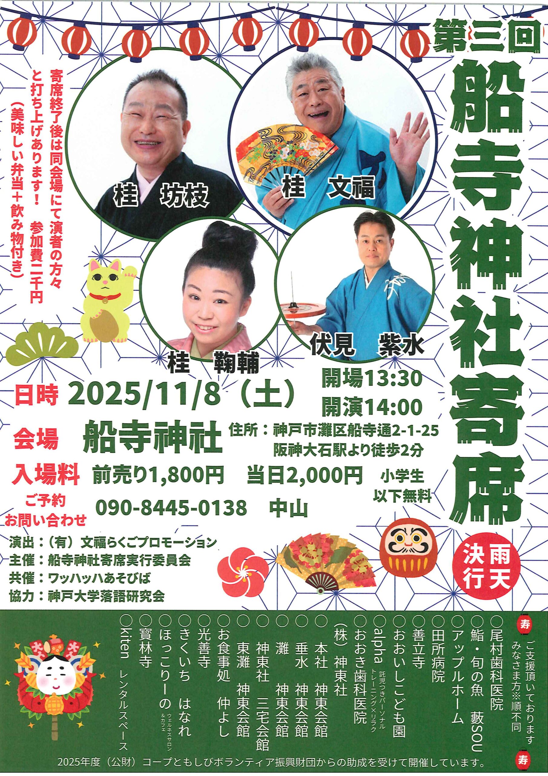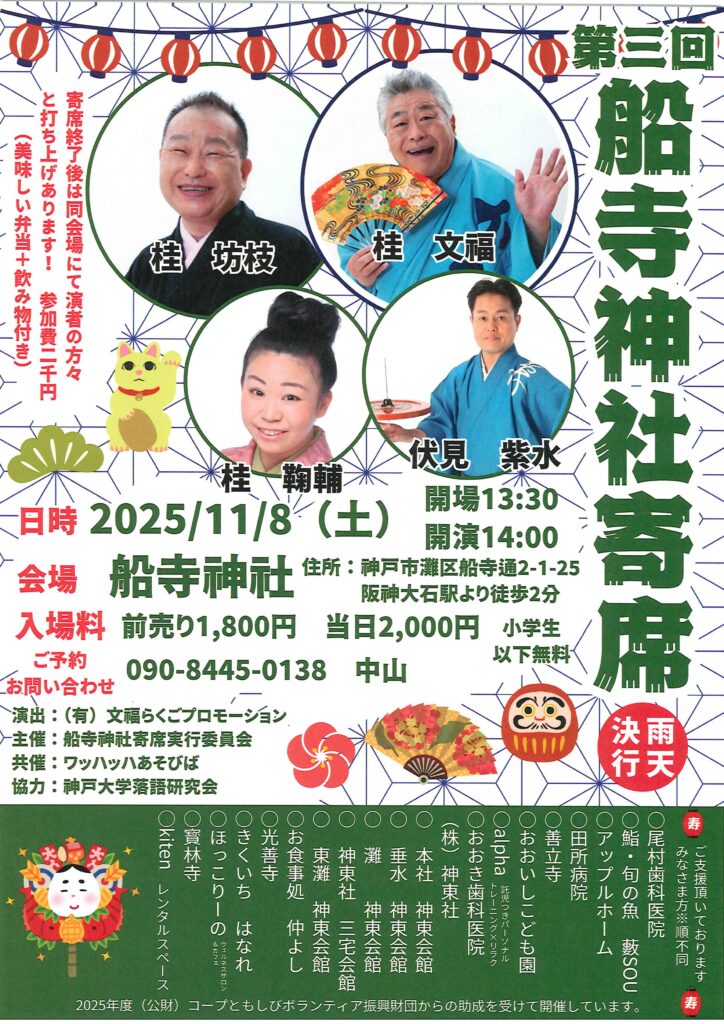 第三回 船寺神社寄席 桂鞠輔桂文福桂坊枝 access_time 2025.11.08 シェア 送る ツイート 公演概要 公演日時 2025年11月8日(土)14時開演(13時30分開場) 場所 船寺神社(神戸市灘区船寺通2-1-25) ♢阪神「大石」駅より徒歩2分 出演者 桂 文福 桂 坊枝 伏見 紫水 桂 鞠輔 料金 当日 2,000 円(小学生以下無料) お問い合わせ Tel 090-8445-0138(中山) « 前へ一覧へ 次へ » 直近の落語会情報 2025年10月18日 動楽亭 昼席 10月席 桂雀三郎桂鯛蔵桂あさ吉笑福亭鶴笑桂三象 2025年10月18日 表現者工房プレゼンツ 落語×講談 劇的「噺」 月亭遊方 2025年10月18日 第13回 新治さかぐら寄席@太陽 露の新幸露の新治