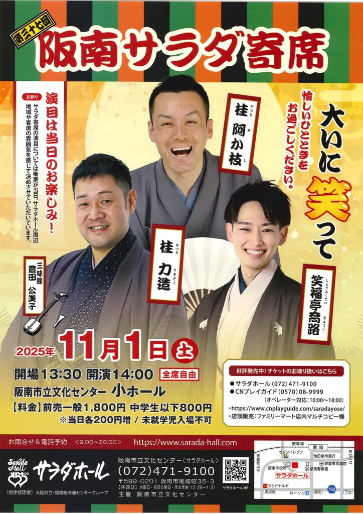 第三十七回 阪南サラダ寄席 笑福亭喬路桂阿か枝桂力造 access_time 2025.11.01 シェア 送る ツイート 公演概要 公演日時 2025年 11月1日(土)14時00分開演(13時30分開場) 場所 阪南市立文化センター小ホール(阪南市尾崎町35-3) 出演者 桂 阿か枝 桂 力造 笑福亭 喬路 三味線:豊田 公美子 料金 前売一般 1,800 円 中学生以下 800 円 ※当日各 200 円増し お問い合わせ 《阪南市立文化センター(サラダホール)》 Tel 072-471-9100 « 前へ一覧へ 次へ » 直近の落語会情報 2025年10月15日 雀五郎・天使ふたり会 桂雀五郎月亭天使 2025年10月15日 こんばんは寄席 桂枝之進 2025年10月16日 動楽亭 昼席 10月席 桂 文華桂弥っこ桂二乗桂慶治朗桂米之助林家染雀