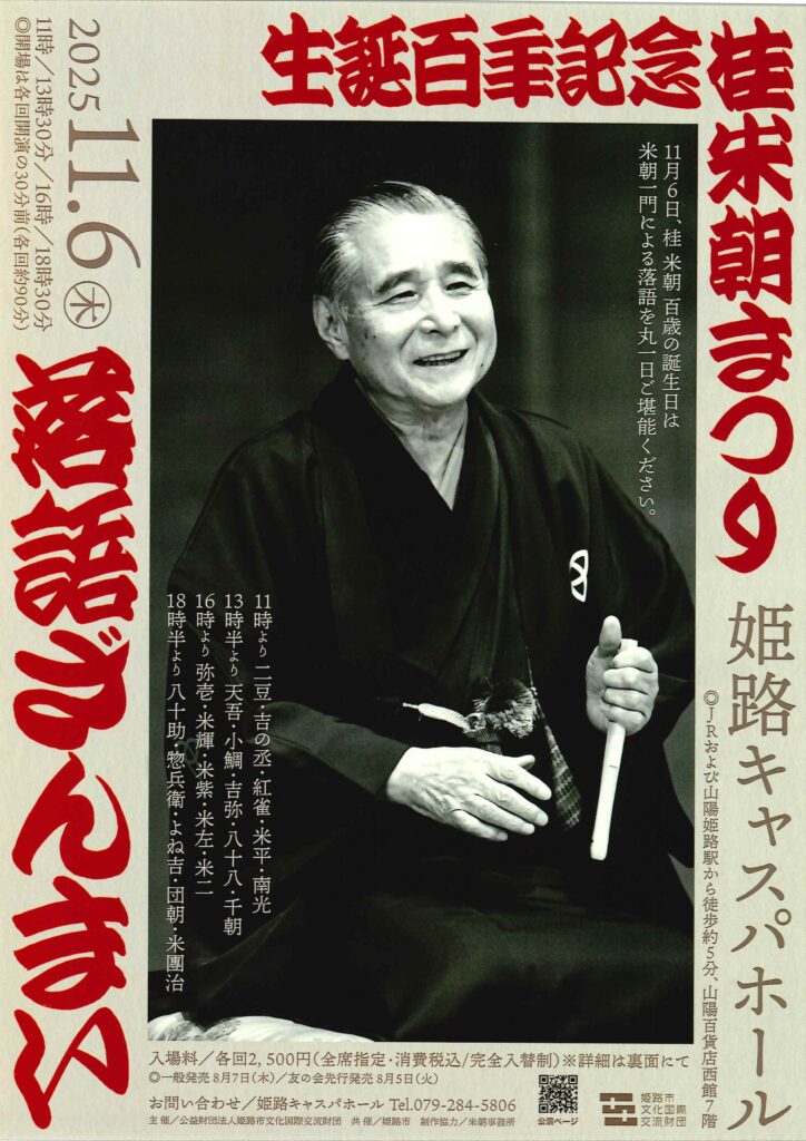 生誕百年記念 桂 米朝まつり 落語ざんまい 桂千朝桂小鯛桂吉弥桂 八十八 access_time 2025.11.06 シェア 送る ツイート 公演概要 公演日時 2025年11月6日(木)13時30分開演(13時開場) 場所 姫路キャンパスホール ♢JR「姫路」駅および「山陽姫路」駅から徒歩約5分 山陽百貨店西館7階 出演者 桂 千朝 桂 八十八 桂 吉弥 桂 小鯛 桂 天吾 料金 各回 2,500 円 お問い合わせ 《姫路キャンパスホール》 Tel 079-284-5806 « 前へ一覧へ 次へ » 直近の落語会情報 2025年10月15日 雀五郎・天使ふたり会 桂雀五郎月亭天使 2025年10月15日 こんばんは寄席 桂枝之進 2025年10月16日 動楽亭 昼席 10月席 林家染雀桂 文華桂弥っこ桂二乗桂慶治朗桂米之助