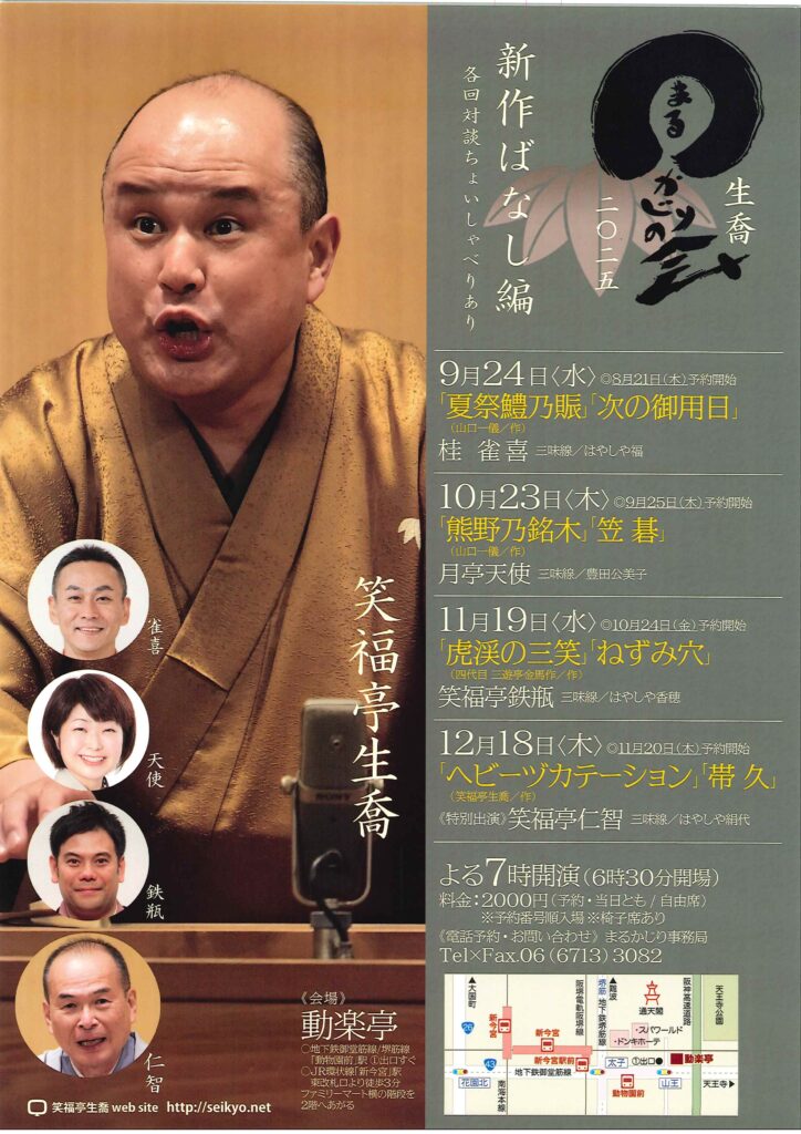 生喬まるかじりの会2025 新作ばなし編 笑福亭鉄瓶笑福亭生喬はやしや香穂 access_time 2025.11.19 シェア 送る ツイート 公演概要 公演日時 2025年11月19日(水)19時開演(18時30分開場) 場所 動楽亭 ♢地下鉄御堂筋線/堺筋線「動物園前」駅①出口すぐ ♢JR環状線「新今宮」駅東改札より徒歩3分 ファミリーマート横の階段を2階へ上がる 出演者 笑福亭 生喬 「虎渓の三笑(作:四代目 三遊亭金馬)」 「ねずみ穴」 笑福亭 鉄瓶 三味線:はやしや 香穂 料金 予約・当日共 2,000 円(自由席) ※予約番号順入場 ※椅子席あり お問い合わせ Tel・Fax 06-6713-3082(まるかじり事務局) « 前へ一覧へ 次へ » 直近の落語会情報 2025年10月26日 第二一四回 須磨寺落語会~笑芸の秋です~ 桂雀五郎笑福亭鶴二桂梅団治笑福亭恭瓶桂雪鹿 2025年10月26日 古希記念 桂 塩鯛 独演会 2025年10月26日 毎月10日間‼連続講談千鳥亭 桂笑金