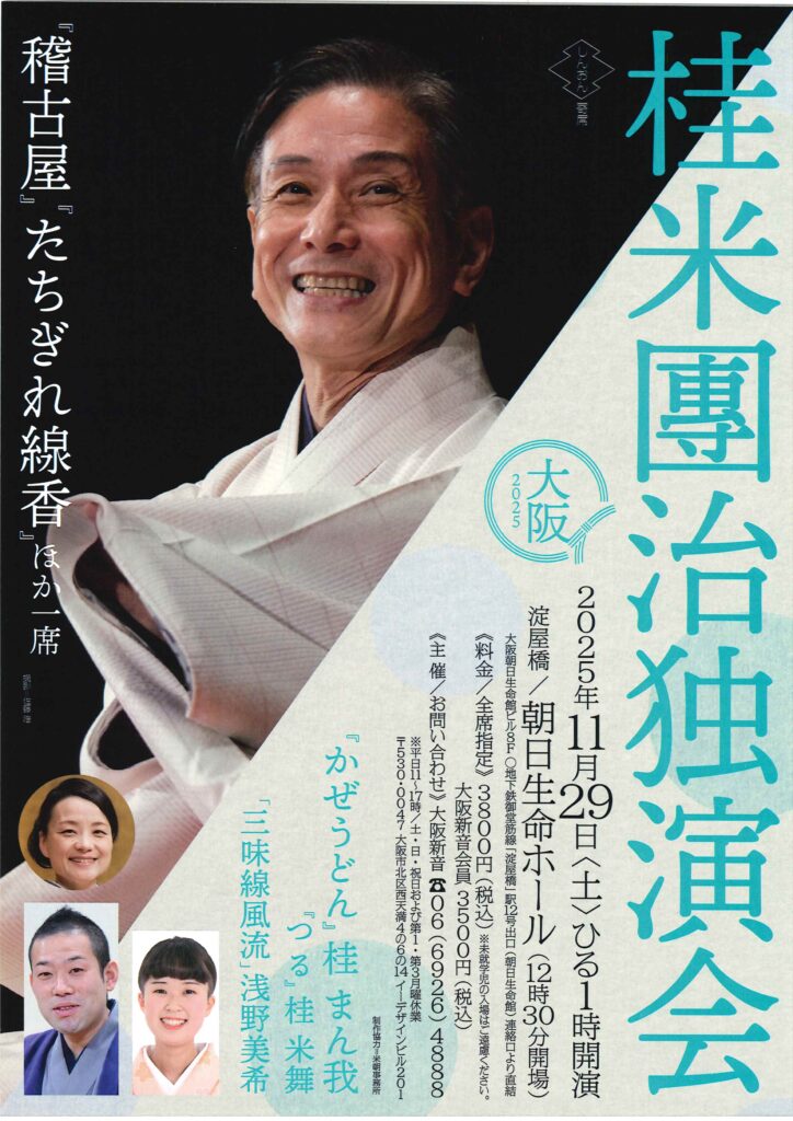 桂 米団治 独演会 桂米団治桂米舞 access_time 2025.11.29 シェア 送る ツイート 公演概要 公演日時 2025年11月29日(土)13時開演(12時30分開場) 場所 朝日生命ホール(大阪朝日生命館ビル8F) ♢地下鉄御堂筋線「淀屋橋」駅12号出口(朝日生命館)連絡口より直結 出演者 桂 米団治 「稽古屋」「たちぎれ線香」ほか一席 桂 まん我 「かぜうどん」 桂 米舞 「つる」 浅野 美紀 「三味線風流」 料金 料金 3,800 円 お問い合わせ 《大阪新音》 Tel 06-6926-4888 « 前へ一覧へ 次へ » 直近の落語会情報 2025年11月23日 第79回 露の都 十八番への道 露の都露の眞桂鞠輔 2025年11月23日 小鯛と米輝 古典と新作 桂米輝桂小鯛 2025年11月23日 芸歴三十周年記念 桂よね吉 京都落語会 桂よね吉桂あさ吉桂二豆