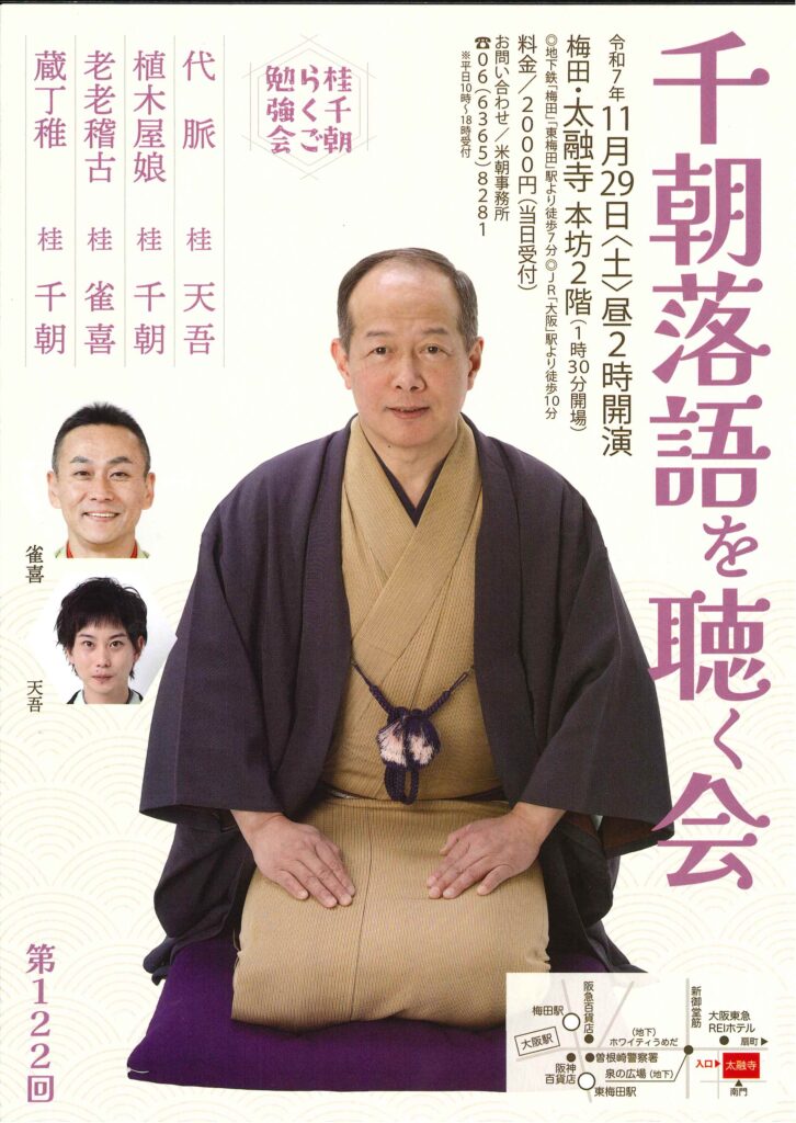 千朝落語を聴く会 桂雀喜桂千朝 access_time 2025.11.29 シェア 送る ツイート 公演概要 公演日時 2025年11月29日(土)14時開演(13時30分開場) 場所 太融寺 本坊2階 ♢地下鉄「梅田」「東梅田」駅より徒歩7分 ♢JR「大阪」駅より徒歩10分 出演者 桂 天吾 「代脈」 桂 千朝 「植木屋娘」 桂 雀喜 「老老稽古」 桂 千朝 「蔵丁稚」 料金 料金 2,000 円(当日受付) お問い合わせ 《米朝事務所》 Tel 06-6365-8281 « 前へ一覧へ 次へ » 直近の落語会情報 2025年11月23日 第79回 露の都 十八番への道 露の眞桂鞠輔露の都 2025年11月23日 小鯛と米輝 古典と新作 桂米輝桂小鯛 2025年11月23日 芸歴三十周年記念 桂よね吉 京都落語会 桂よね吉桂あさ吉桂二豆
