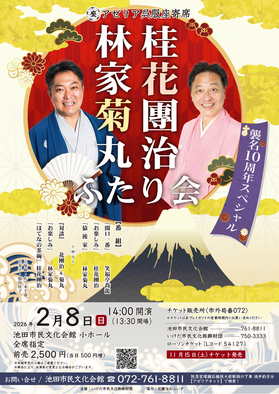アゼリア呉服座寄席 桂 花団治・林家 菊丸 ふたり会 林家菊丸桂花団治笑福亭喬龍 access_time 2026.02.08 シェア 送る ツイート 公演概要 公演日時 2026年2月8日(日)14時開演(13時30分開場) 場所 池田市民文化会館 小ホール(池田市天神1-7-1) ♢阪急宝塚線「石橋阪大前」駅下車 徒歩約8分 出演者 笑福亭 喬龍 「開口一番」 桂 花団治 「お楽しみ」 林家 菊丸 「猿後家」 中入り 花団治&菊丸 《対談》 林家 菊丸 「お楽しみ」 桂 花団治 「はてなの茶碗」 料金 前売 2,500 円 当日 3,000 円 お問い合わせ Tel 072-761-8811(池田市民文化会館) « 前へ一覧へ 次へ » 直近の落語会情報 2025年11月23日 第79回 露の都 十八番への道 露の眞桂鞠輔露の都 2025年11月23日 小鯛と米輝 古典と新作 桂米輝桂小鯛 2025年11月23日 芸歴三十周年記念 桂よね吉 京都落語会 桂よね吉桂あさ吉桂二豆