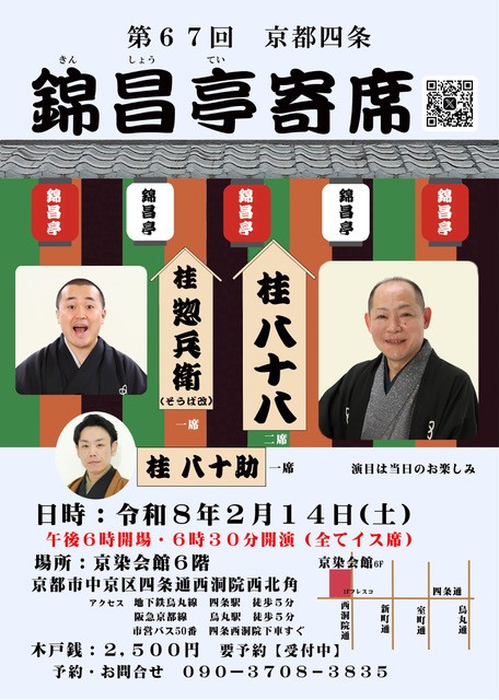 第67回 京都四条 錦昌亭寄席 桂惣兵衛桂八十八桂八十助 access_time 2026.02.14 シェア 送る ツイート 公演概要 公演日時 2026年2月14日(土)18時30分開演(18時開場) 場所 京染会館6階(京都市中京区四条通西洞院西北角) ♢地下鉄烏丸線「四条」駅 徒歩5分 ♢阪急京都線「烏丸」駅 徒歩5分 ♢市営バス50番 「四条西洞院」下車すぐ 出演者 桂 八十八 二席 そうば改メ 桂 惣兵衛 一席 桂 八十助 一席 料金 木戸銭 2,500 円 ※要予約 ※全てイス席 お問い合わせ Tel 090-3708-3835 « 前へ一覧へ 次へ » 直近の落語会情報 2025年11月23日 第79回 露の都 十八番への道 露の眞桂鞠輔露の都 2025年11月23日 小鯛と米輝 古典と新作 桂米輝桂小鯛 2025年11月23日 芸歴三十周年記念 桂よね吉 京都落語会 桂よね吉桂あさ吉桂二豆