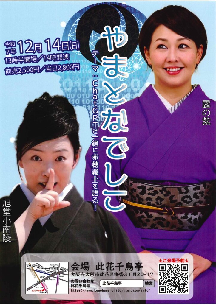 やまとなでしこ access_time 2025.12.14 シェア 送る ツイート 公演概要 公演日時 2025年12月14日(日)14時開演(13時30分) 場所 此花千鳥亭(大阪市此花区梅花3丁目20ー17) 出演者 露の 紫 旭堂 小南陵 料金 前売 2,500 円 当日 2,800 円 お問い合わせ https://www.konohana-chidoritei.com/info/ « 前へ一覧へ 次へ » 直近の落語会情報 2025年11月30日 笑福亭 呂鶴 独演会 笑福亭呂鶴笑福亭呂竹笑福亭呂好笑福亭呂翔 2025年11月30日 道頓堀 笑福亭鶴二 ほのぼの落語会 笑福亭鶴二笑福亭笑有 2025年11月30日 三井寺寄席 月亭八織月亭八方