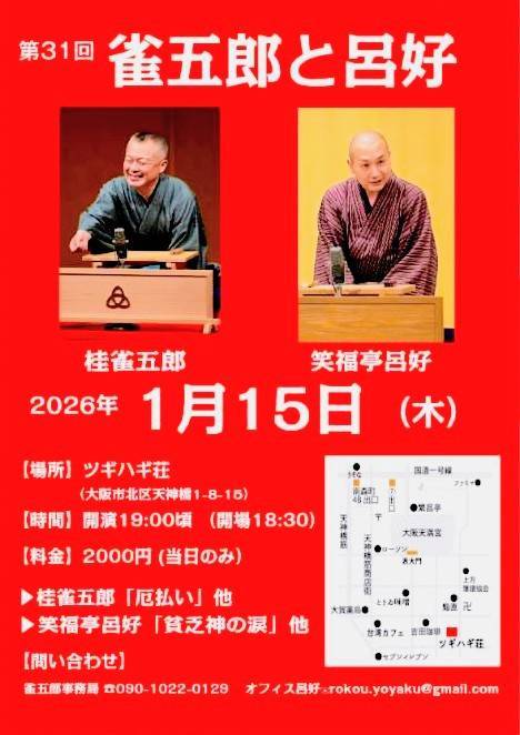 第31回 雀五郎と呂好 桂雀五郎笑福亭呂好 access_time 2026.01.15 シェア 送る ツイート 公演概要 公演日時 2026年1月15日(木)19時開演(18時30分開場) 場所 ツギハギ荘(大阪市北区天神橋1-8-15) ♢大阪メトロ谷町線・堺筋線「南森町」駅 JR東西線「大阪天満宮」駅より各徒歩8分 出演者 桂 雀五郎 「厄払い」他一席 笑福亭 呂好 「貧乏神の涙」他一席 料金 2,000 円(当日のみ) お問い合わせ Tel 090-1022-0129(雀五郎事務局) Mail rokou.yoyaku@gmail.com(オフィス呂好) « 前へ一覧へ 次へ » 直近の落語会情報 2025年12月06日 笑福亭喬若のなるほど落語12ヶ月 笑福亭喬若 2025年12月06日 第44回 浪切寄席 せんしゅう亭 ~笑福亭鉄瓶の会~ 笑福亭鉄瓶桂九ノ一桂雪鹿 2025年12月06日 次代育成落語会 月亭方正林家笑丸はやしや美紀桂福留露の瑞笑福亭仁智