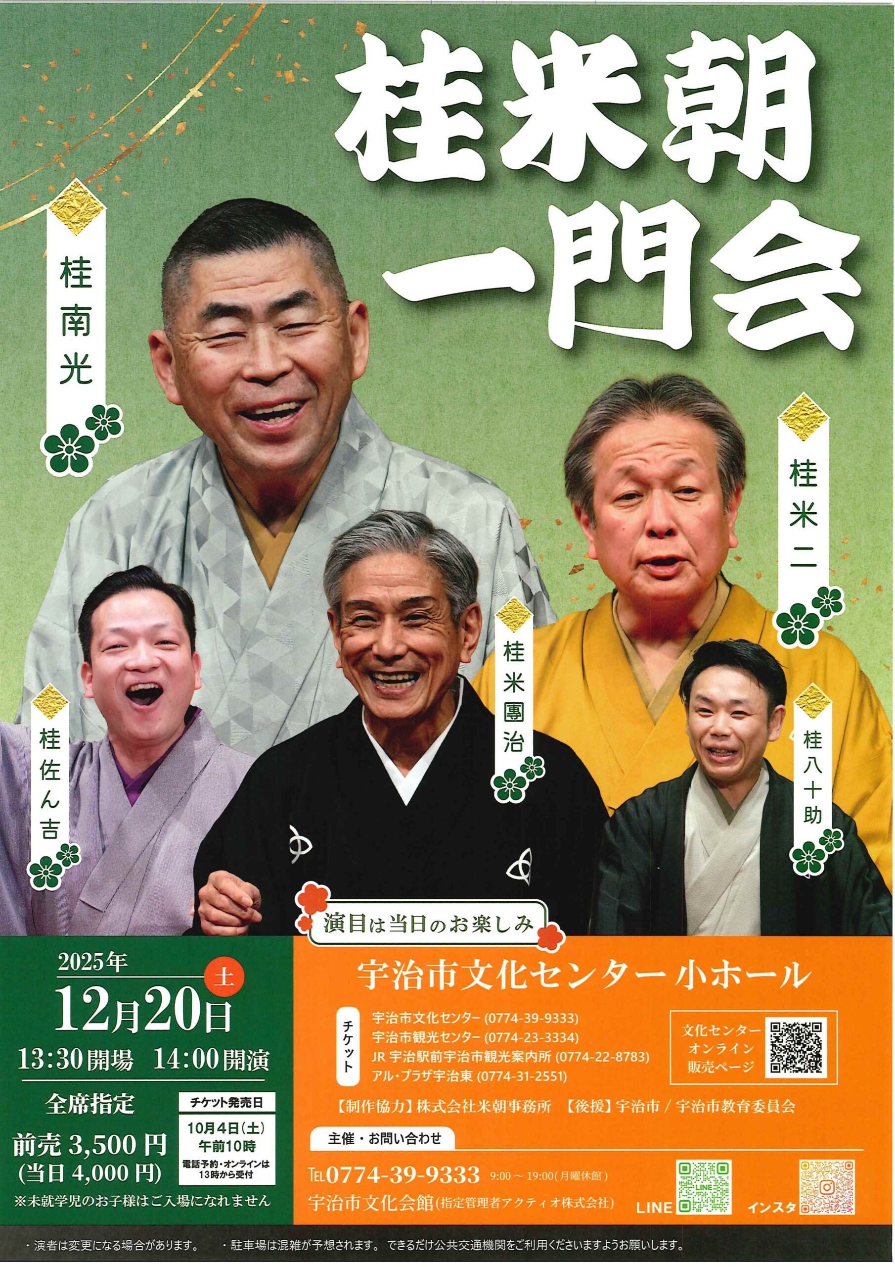 桂米朝 一門会 桂八十助桂南光桂米二桂米団治桂佐ん吉 access_time 2025.12.20 シェア 送る ツイート 公演概要 公演日時 2025年12月20日(土)14時開演(13時30分開場) 場所 宇治市文化センター 小ホール 出演者 桂 南光 桂 米二 桂 米団治 桂 佐ん吉 桂 八十助 料金 前売 3,500 円 当日 4,000 円 お問い合わせ Tel 0774-39-9333(宇治市文化会館) « 前へ一覧へ 次へ » 直近の落語会情報 2025年12月19日 雀五郎体力強化の会 その185 桂弥っこ桂雀五郎桂雪鹿 2025年12月19日 第六回 あおば自身の会 桂春蝶笑福亭笑有桂あおば 2025年12月20日 桂米朝 一門会 桂八十助桂南光桂米二桂米団治桂佐ん吉