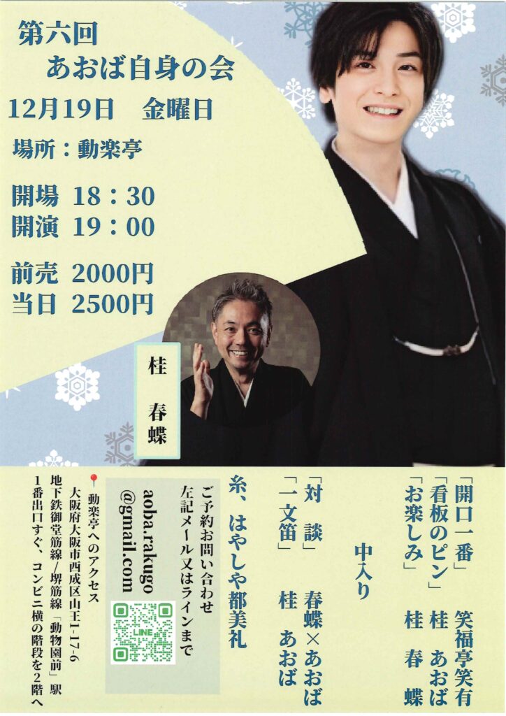 第六回 あおば自身の会 桂あおば桂春蝶笑福亭笑有 access_time 2025.12.19 シェア 送る ツイート 公演概要 公演日時 2025月12月19日(金)19時開演(18時30分開場) 場所 動楽亭(大阪市西成区山王1-17-6) ♢地下鉄御堂筋線/堺筋線「動物園前」駅1番出口すぐ コンビニ横の階段を2階へ 出演者 笑福亭 笑有 「開口一番」 桂 あおば 「看板のピン」 桂 春蝶 「お楽しみ」 ―中入り― 桂 春蝶×桂 あおば 対談 桂 あおば 「一文笛」 三味線:はやしや 都美礼 料金 前売 2,000円 当日 2,500円 お問い合わせ Mail aoba.rakugo@gmail.com « 前へ一覧へ 次へ » 直近の落語会情報 2025年12月18日 生喬まるかじりの会2025 新作ばなし編 笑福亭仁智笑福亭生喬はやしや絹代 2025年12月18日 希遊の新作再構築らくご会in西宮えびす亭 月亭希遊 2025年12月19日 雀五郎体力強化の会 その185 桂雀五郎桂雪鹿桂弥っこ