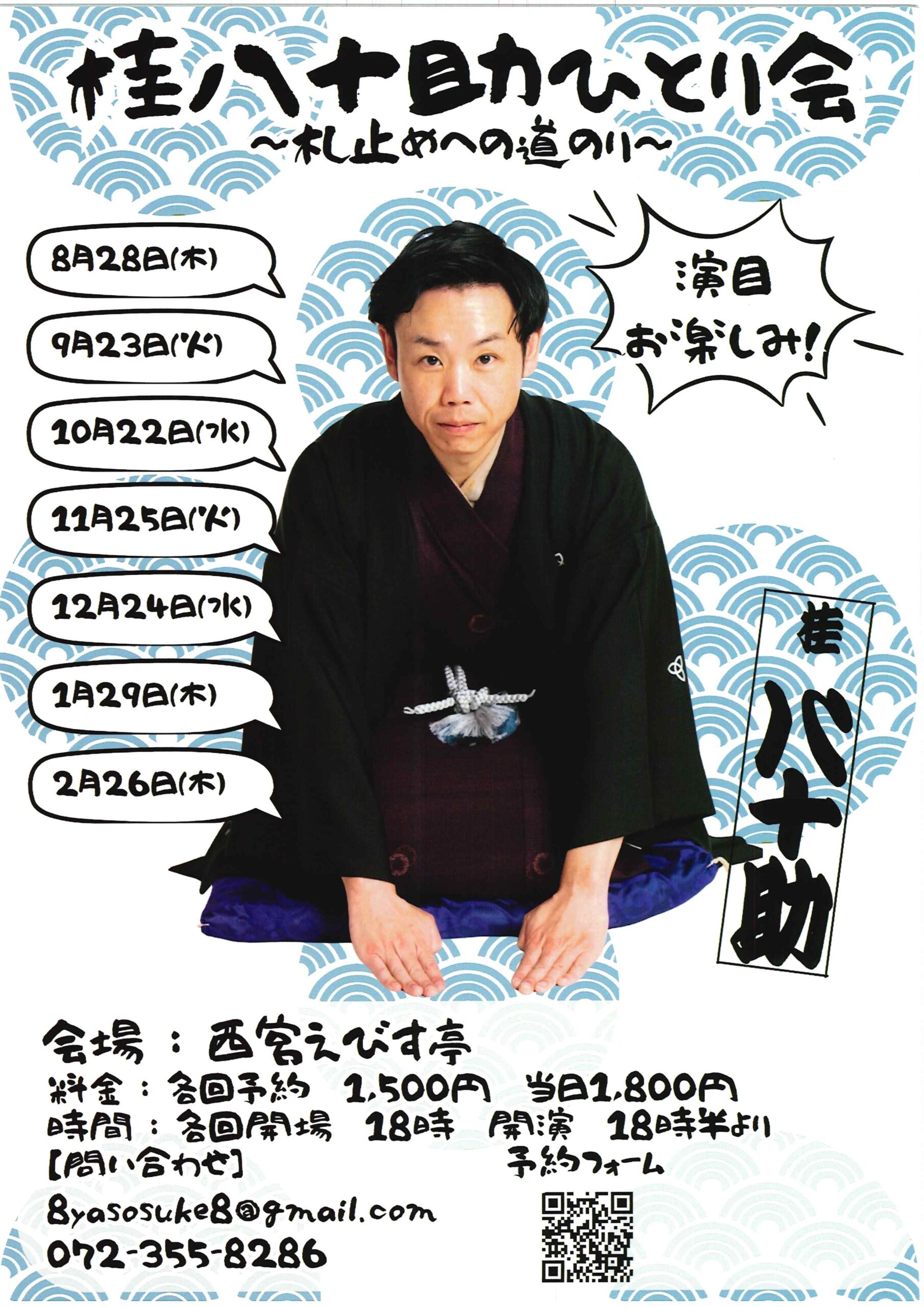 桂八十助ひとり会~札止めへの道のり~ 桂八十助 access_time 2025.12.24 シェア 送る ツイート 公演概要 公演日時 2025年12月24日(水)18時30分開演(18時開場) 場所 西宮えびす亭 出演者 桂 八十助 料金 予約 1,500 円 当日 1,800 円 お問い合わせ Tel 072-355-8286 Mail 8yasosuke8@gmail.com « 前へ一覧へ 次へ » 直近の落語会情報 2025年12月19日 雀五郎体力強化の会 その185 桂弥っこ桂雀五郎桂雪鹿 2025年12月19日 第六回 あおば自身の会 桂あおば桂春蝶笑福亭笑有 2025年12月20日 桂米朝 一門会 桂米二桂米団治桂佐ん吉桂八十助桂南光