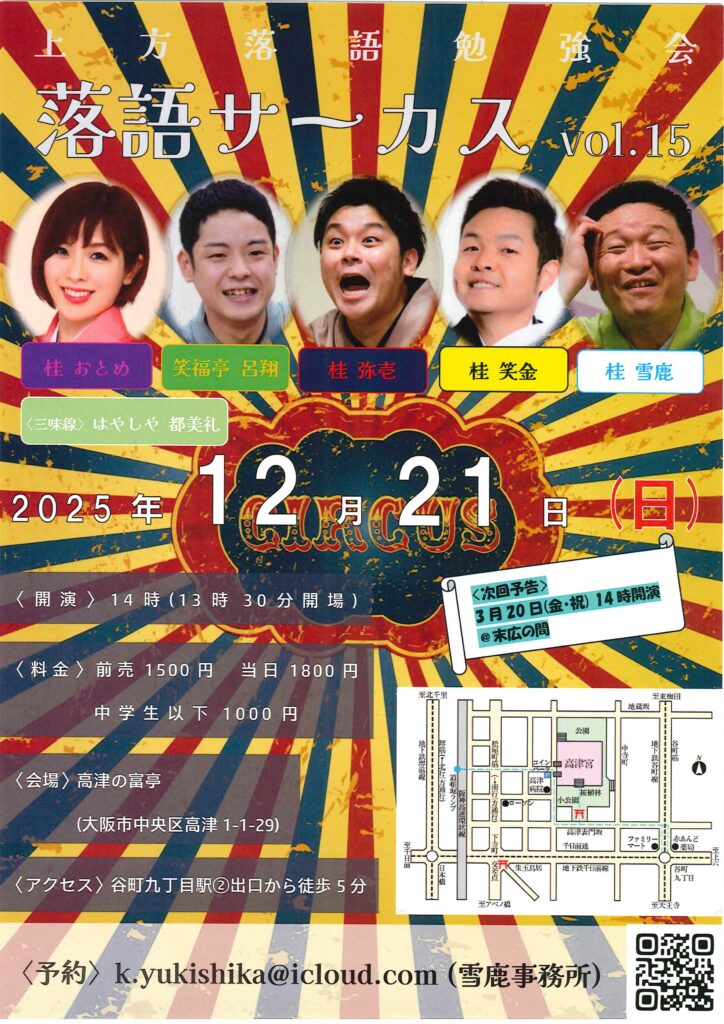 上方落語勉強会 落語サーカス vol.15 桂おとめ桂弥壱桂雪鹿笑福亭呂翔桂笑金 access_time 2025.12.21 シェア 送る ツイート 公演概要 公演日時 2025年12月21日(日)14時開演(13時30分開場) 場所 高津の富亭(大阪市中央区高津1-1-29) ♢「谷町九丁目」駅②出口から徒歩5分 出演者 桂 おとめ 笑福亭 呂翔 桂 弥壱 桂 笑金 桂 雪鹿 料金 前売 1,500円 当日 1,800円 中学生以下 1,000 円 お問い合わせ Mail k.yukishika@icloud.com « 前へ一覧へ 次へ » 直近の落語会情報 2025年12月18日 生喬まるかじりの会2025 新作ばなし編 笑福亭仁智笑福亭生喬はやしや絹代 2025年12月18日 希遊の新作再構築らくご会in西宮えびす亭 月亭希遊 2025年12月19日 雀五郎体力強化の会 その185 桂雀五郎桂雪鹿桂弥っこ