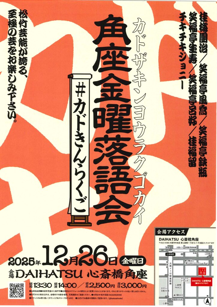 角座金曜落語会 笑福亭鉄瓶笑福亭風喬笑福亭生寿桂梅団治笑福亭呂好桂福留 access_time 2025.12.26 シェア 送る ツイート 公演概要 公演日時 2025年12月26日(金)14時開演(13時30分開場) 場所 DAIHATSU 心斎橋角座(大阪市中央区東心斎橋1丁目10-11 鰻谷スクエアB1F) 出演者 桂 梅団治 笑福亭 風喬 笑福亭 鉄瓶 笑福亭 生寿 笑福亭 呂好 桂 福留 チキチキジョニー 料金 前売 2,500 円 当日 3,000 円 お問い合わせ Tel 06-6258-8085(松竹芸能) « 前へ一覧へ 次へ » 直近の落語会情報 2025年12月18日 生喬まるかじりの会2025 新作ばなし編 笑福亭仁智笑福亭生喬はやしや絹代 2025年12月18日 希遊の新作再構築らくご会in西宮えびす亭 月亭希遊 2025年12月19日 雀五郎体力強化の会 その185 桂弥っこ桂雀五郎桂雪鹿