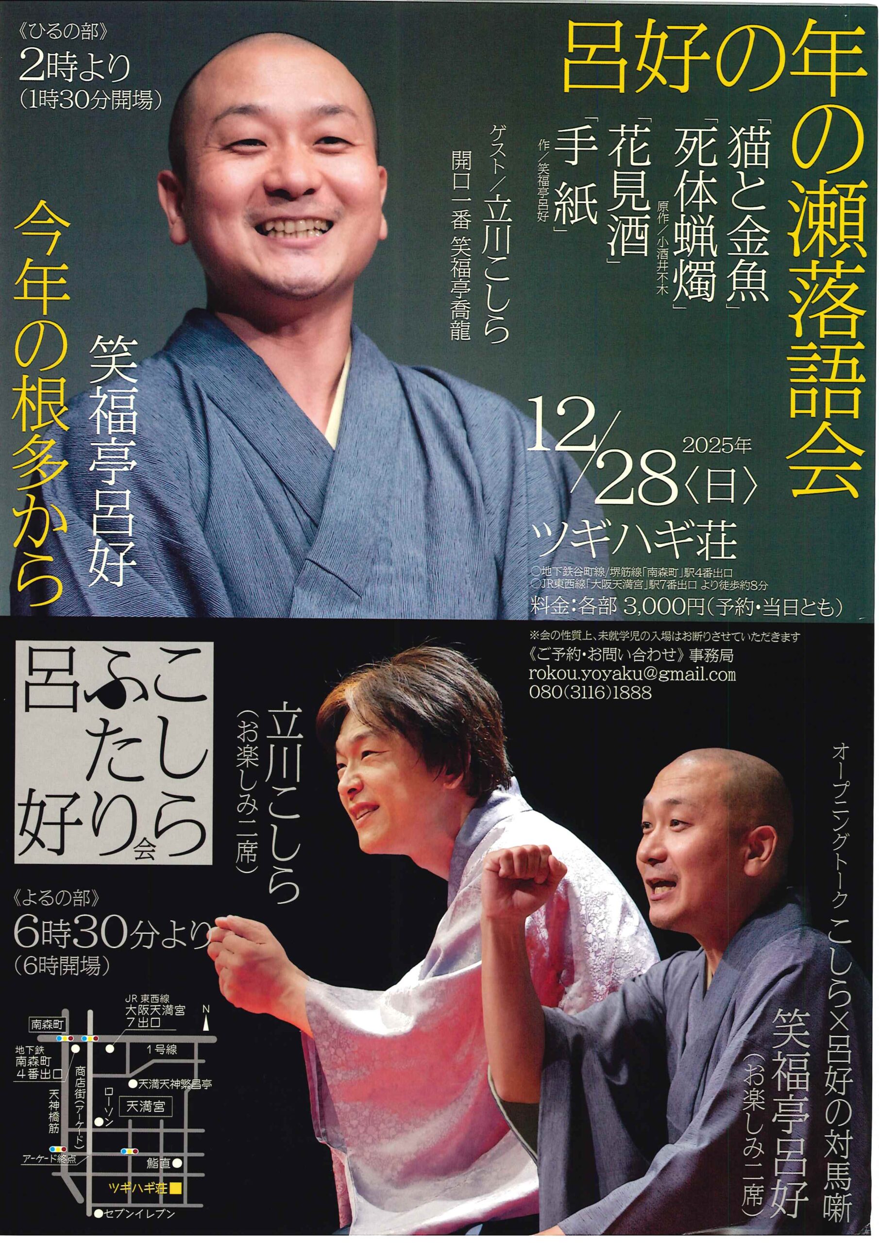 呂好の年の瀬落語会 笑福亭呂好笑福亭喬龍 access_time 2025.12.28 シェア 送る ツイート 公演概要 公演日時 2025年12月28日(日)14時開演(13時30分開場) 場所 ツギハギ荘 ♢地下鉄谷町線/堺筋線「南森町」駅4番出口 JR東西線「大阪天満宮」駅7番出口より徒歩約8分 出演者 笑福亭 呂好 「猫と金魚」 「死体蝋燭(原作:小酒井不木)」 「花見酒」 「手紙(作:笑福亭呂好)」 ゲスト:立川 こしら 笑福亭 喬龍 開口一番 料金 3,000 円(予約・当日とも) お問い合わせ Tel 080-3116-1888 Mail rokou.yoyaku@gmail.com « 前へ一覧へ 次へ » 直近の落語会情報 2025年12月18日 生喬まるかじりの会2025 新作ばなし編 笑福亭仁智笑福亭生喬はやしや絹代 2025年12月18日 希遊の新作再構築らくご会in西宮えびす亭 月亭希遊 2025年12月19日 雀五郎体力強化の会 その185 桂弥っこ桂雀五郎桂雪鹿