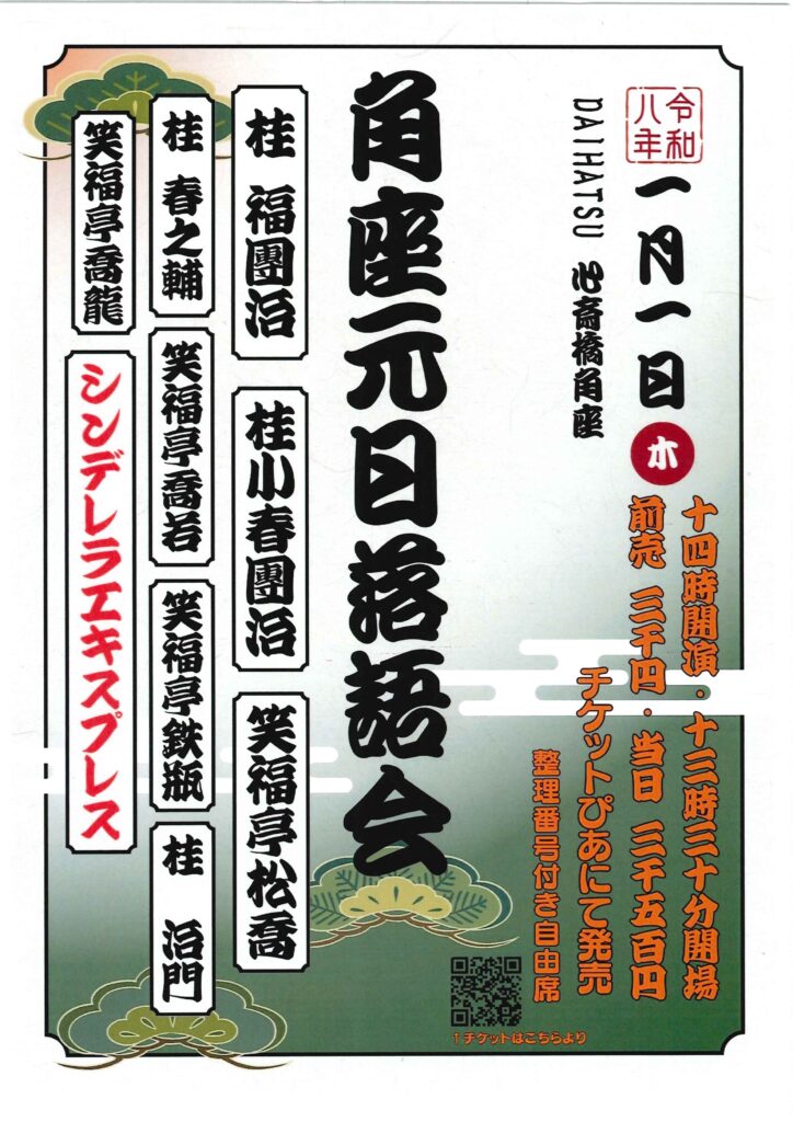 角座元日落語会 笑福亭喬龍笑福亭鉄瓶笑福亭喬若桂小春団治桂治門桂春之輔桂福団治笑福亭松喬 access_time 2026.01.01 シェア 送る ツイート 公演概要 公演日時 2026年1月1日(木)14時開演(13時30分開場) 場所 DAIHATSU 心斎橋角座 出演者 桂 福団治 桂 小春団治 笑福亭 松喬 桂 春之輔 笑福亭 喬若 笑福亭 鉄瓶 桂 治門 笑福亭 喬龍 シンデレラエキスプレス 料金 前売 3,000 円 当日 3,500 円(整理番号付き自由席) お問い合わせ « 前へ一覧へ 次へ » 直近の落語会情報 2025年12月17日 呂好一人勉強会 笑福亭呂好 2025年12月18日 生喬まるかじりの会2025 新作ばなし編 笑福亭仁智笑福亭生喬はやしや絹代 2025年12月18日 希遊の新作再構築らくご会in西宮えびす亭 月亭希遊
