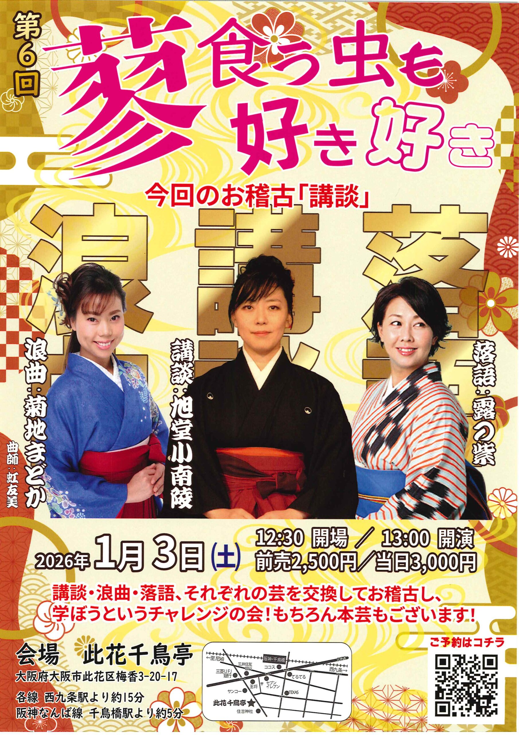 第6回 蓼食う虫も好き好き 露の紫 access_time 2026.01.03 シェア 送る ツイート 公演概要 公演日時 2026年1月3日(土)13時開演(12時30分開場) 場所 此花千鳥亭(大阪市此花区梅花3-20-17) ♢各線「西九条」駅より約15分 ♢阪神なんば線「千鳥橋」駅より約5分 出演者 露の 紫 旭堂 小南陵 菊地 まどか(曲師/虹友美) 料金 前売 2,500 円 当日 3,000 円 お問い合わせ ℡ « 前へ一覧へ 次へ » 直近の落語会情報 2025年12月18日 生喬まるかじりの会2025 新作ばなし編 はやしや絹代笑福亭仁智笑福亭生喬 2025年12月18日 希遊の新作再構築らくご会in西宮えびす亭 月亭希遊 2025年12月19日 雀五郎体力強化の会 その185 桂弥っこ桂雀五郎桂雪鹿