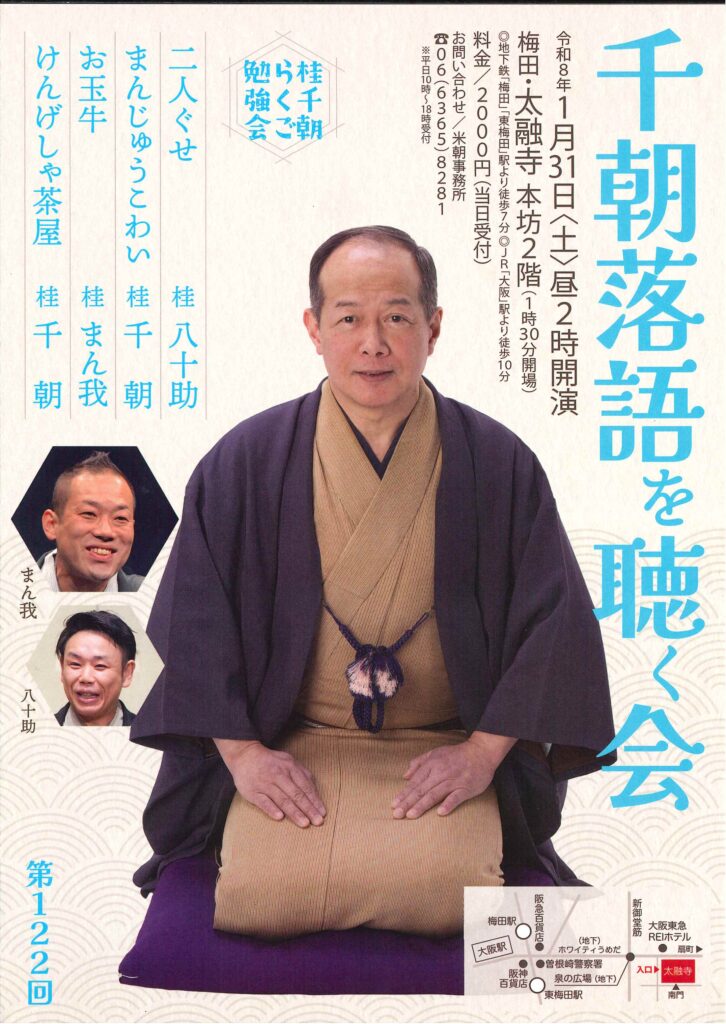 千朝落語を聴く会 桂千朝桂八十助 access_time 2026.01.31 シェア 送る ツイート 公演概要 公演日時 2026年1月31日(土)14時開演(13時30分開場) 場所 太融寺 本坊2階 ♢地下鉄「梅田」「東梅田」駅より徒歩7分 ♢JR「大阪」駅より徒歩10分 出演者 桂 八十助 「二人ぐせ」 桂 千朝 「まんじゅうこわい」 桂 まん我 「お玉牛」 桂 千朝 「けんげしゃ茶屋」 料金 料金 2,000 円(当日受付) お問い合わせ 《米朝事務所》 Tel 06-6365-8281 « 前へ一覧へ 次へ » 直近の落語会情報 2026年01月15日 第31回 雀五郎と呂好 桂雀五郎笑福亭呂好 2026年01月15日 動楽亭 昼席 1月席 桂八十助月亭遊方桂団治郎桂佐ん吉桂福団治 2026年01月16日 第109回 梅田にぎわい亭 桂雀太桂雀喜桂雀五郎桂源太