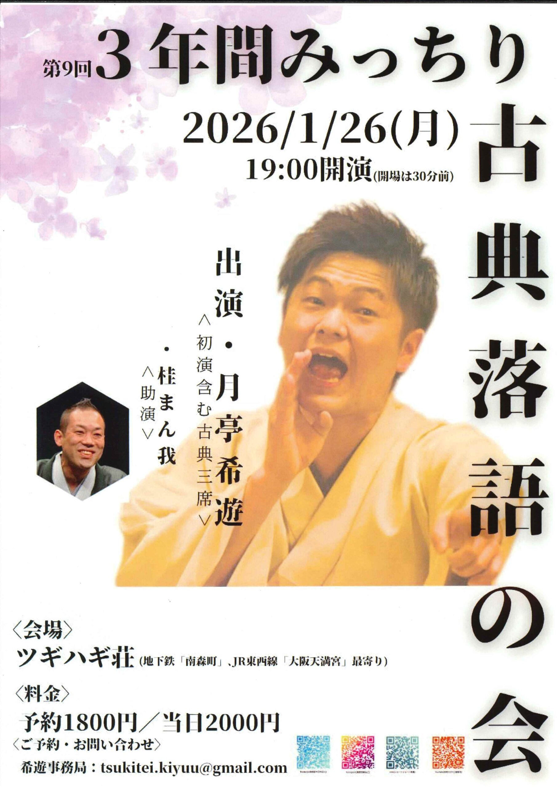 第9回 3年間みっちり古典落語の会 月亭希遊 access_time 2026.01.26 シェア 送る ツイート 公演概要 公演日時 2026年1月26日(月)19時開演(18時30分開場) 場所 ツギハギ荘 ♢地下鉄「南森町」駅、JR東西線「大阪天満宮」駅最寄り 出演者 月亭 希遊 助演:桂 まん我 料金 予約 1,800 円 当日 2,000 円 お問い合わせ Mail tsukitei.kiyuu@gmail.com « 前へ一覧へ 次へ » 直近の落語会情報 2026年01月15日 第31回 雀五郎と呂好 桂雀五郎笑福亭呂好 2026年01月15日 動楽亭 昼席 1月席 月亭遊方桂団治郎桂佐ん吉桂福団治桂八十助 2026年01月16日 第109回 梅田にぎわい亭 桂雀太桂雀喜桂雀五郎桂源太