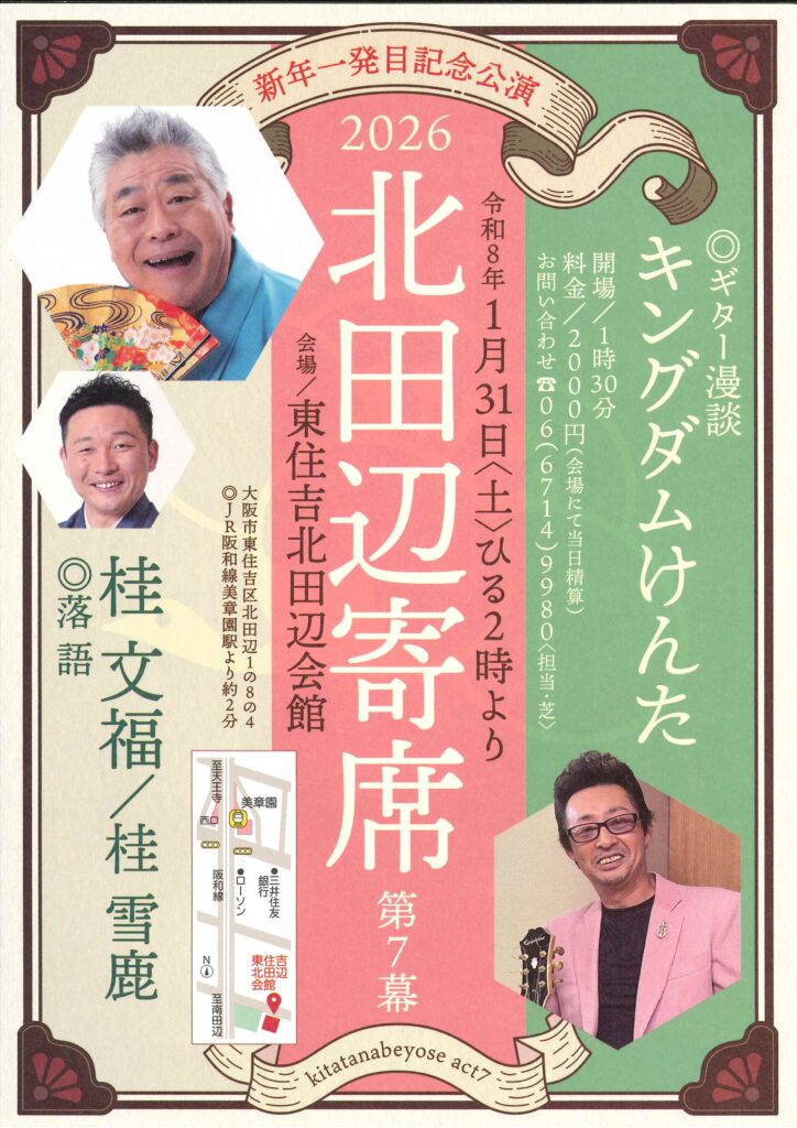 北田辺寄席 第7幕 桂文福桂雪鹿 access_time 2026.01.31 シェア 送る ツイート 公演概要 公演日時 2026年1月31日(土)14時開演(13時30分開場) 場所 東住吉北田辺会館(大阪市東住吉区北田辺1-8-4) ♢JR阪和線「美章園」駅より約2分 出演者 桂 文福 桂 雪鹿 キングダムけんた(ギター漫談) 料金 当日 2,000 円(会場にって当日精算) お問い合わせ Tel 06-6714-9980 « 前へ一覧へ 次へ » 直近の落語会情報 2026年01月15日 第31回 雀五郎と呂好 桂雀五郎笑福亭呂好 2026年01月15日 動楽亭 昼席 1月席 桂団治郎桂佐ん吉桂福団治桂八十助月亭遊方 2026年01月16日 第109回 梅田にぎわい亭 桂雀太桂雀喜桂雀五郎桂源太
