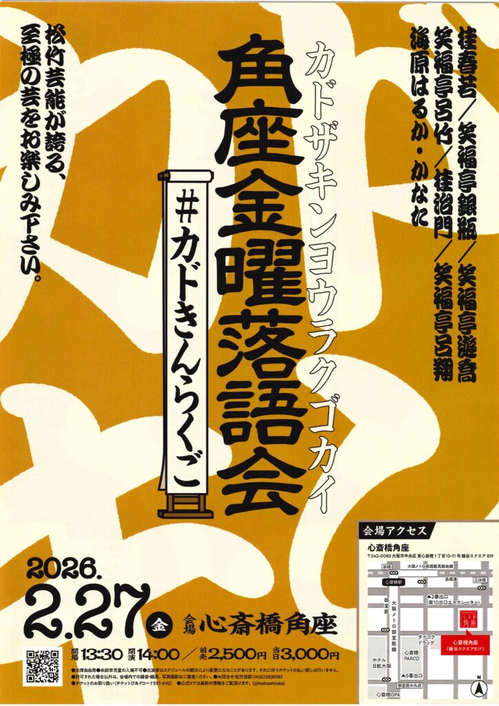 角座金曜落語会 桂春若笑福亭遊喬桂治門笑福亭呂竹笑福亭銀瓶笑福亭呂翔 access_time 2026.02.27 シェア 送る ツイート 公演概要 公演日時 2026年2月27日(金)14時開演(13時30分開場) 場所 心斎橋角座(大阪市中央区東心斎橋1丁目10-11 鰻谷スクエアB1F) 出演者 桂 春若 笑福亭 銀瓶 笑福亭 遊喬 笑福亭 呂竹 桂 治門 笑福亭 呂翔 海原はるか・かなた 料金 前売 2,500 円 当日 3,000 円 お問い合わせ Tel 06-6258-8085(松竹芸能) « 前へ一覧へ 次へ » 直近の落語会情報 2026年02月18日 雀五郎・天使ふたり会 桂雀五郎月亭天使 2026年02月18日 第七回 落語実験ラボ 桂歌之助桂雀喜 2026年02月18日 動楽亭 昼席 2月席 桂福矢露の都桂米舞桂雀太桂よね吉桂慶治朗