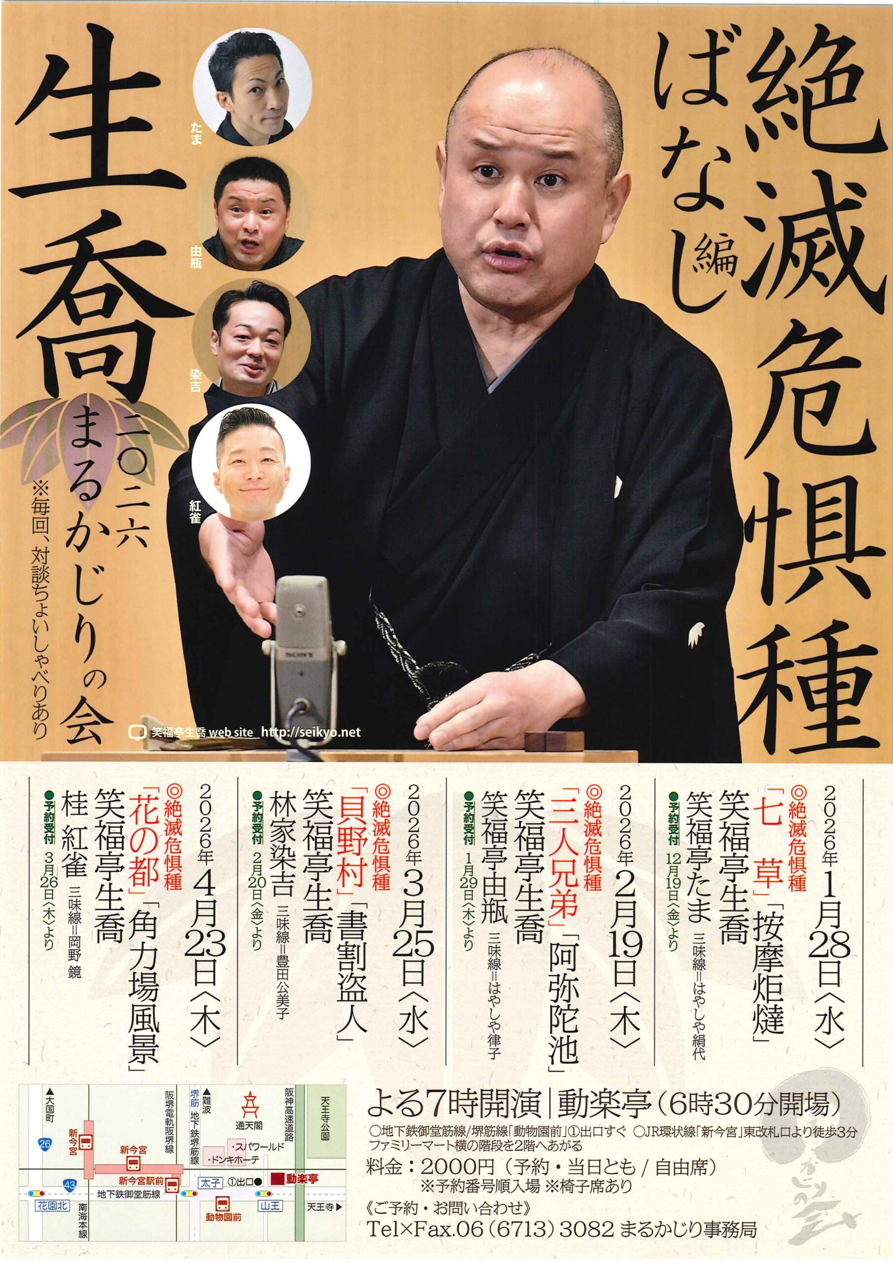 2026生喬まるかじりの会 絶滅危惧種ばなし編 林家染吉笑福亭生喬 access_time 2026.03.25 シェア 送る ツイート 公演概要 公演日時 2026年3月25日(水)19時開演(18時30分開場) 場所 動楽亭 ♢地下鉄御堂筋線/堺筋線「動物園前」①出口すぐ ♢JR環状線「新今宮」東改札口より徒歩3分 出演者 笑福亭 生喬 「貝野村」「書割盗人」 林家 染吉 三味線:豊田 公美子 料金 料金 2,000 円(予約・当日とも) お問い合わせ Tel・Fax 06-6713-3082(まるかじり事務局) « 前へ一覧へ 次へ » 直近の落語会情報 2026年02月22日 かい枝 阿か枝 落語会 桂阿か枝桂かい枝 2026年02月22日 桂米団治独演会 桂米団治 2026年02月22日 継ぐこと・伝えること67-違いを愉しむ、東西の落語― 桂佐ん吉