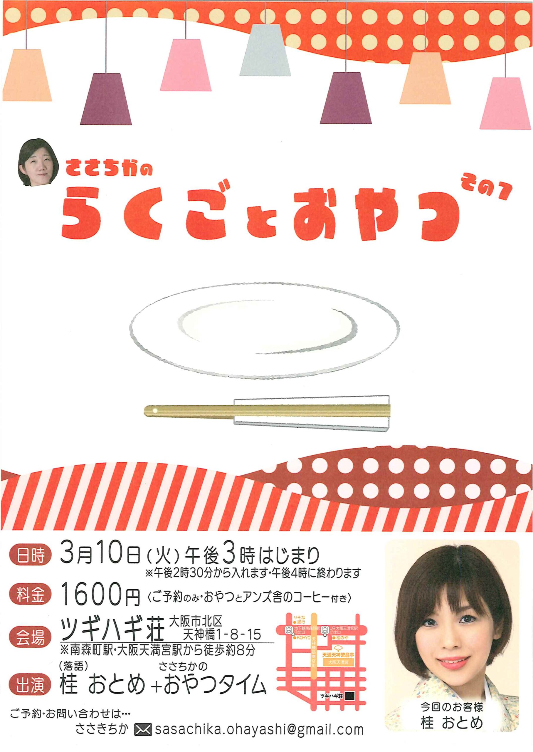 ささちかの らくごとおやつ その7 佐々木千華桂おとめ access_time 2026.03.10 シェア 送る ツイート 公演概要 公演日時 2026年3月10日(火)15時開演(2時30分開場) 場所 ツギハギ荘(大阪市北区天神橋1-8-15) ♢「南森町」駅・「大阪天満宮」駅から徒歩約8分 出演者 桂 おとめ 佐々木 千華 料金 1,600 円(ご予約のみ・おやつとアンズ舎のコーヒー付き) お問い合わせ Mail sasachika.ohayashi@gmail.com « 前へ一覧へ 次へ » 直近の落語会情報 2026年02月19日 毎月10日間‼連続講談千鳥亭 笑福亭松五 2026年02月19日 2026生喬まるかじりの会 絶滅危惧種ばなし編 笑福亭由瓶笑福亭生喬はやしや律子 2026年02月19日 落語会ミドルチームの昼から木曜寄席! 笑福亭右喬桂三歩桂花団治