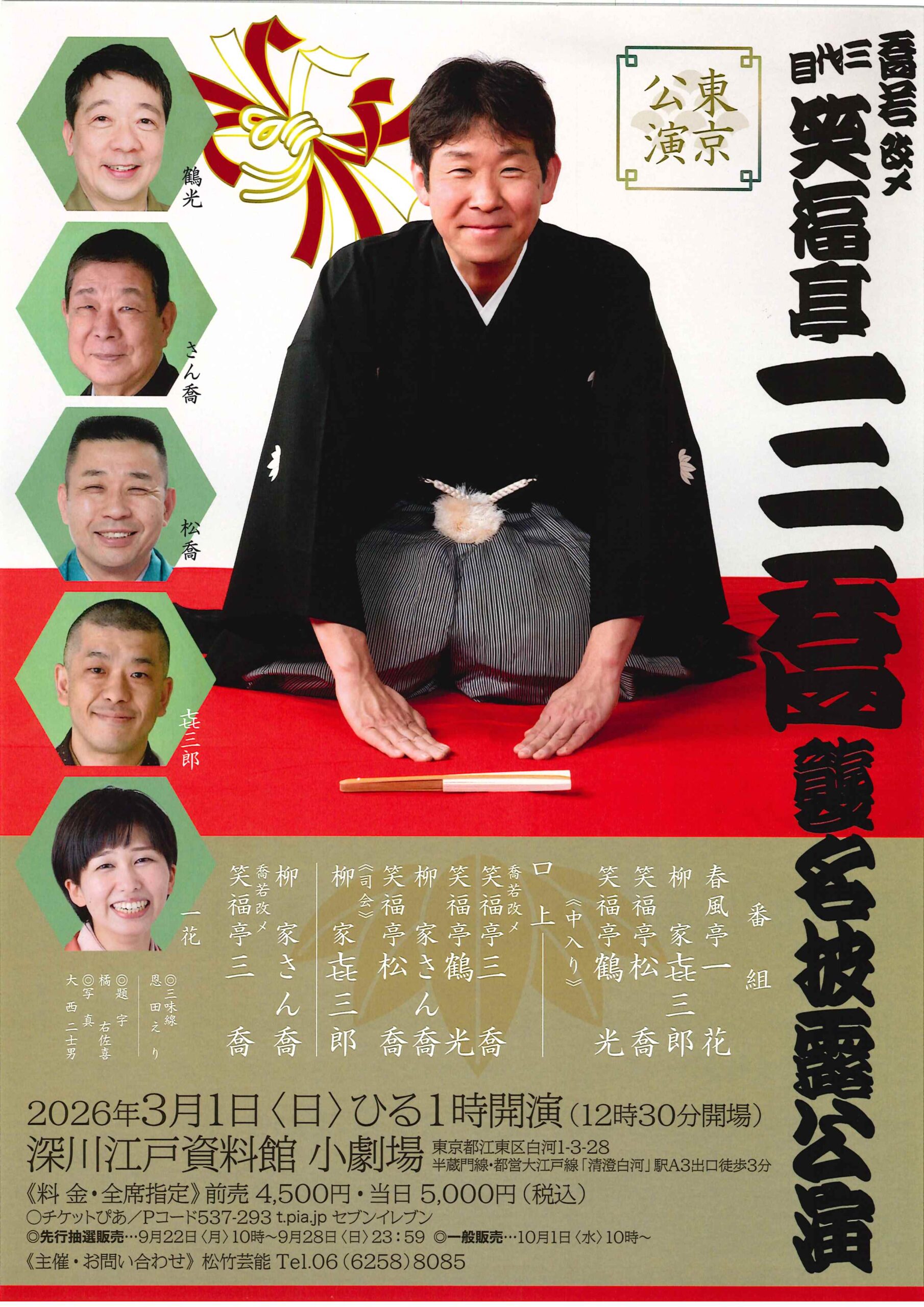 喬若改メ 三代目 笑福亭三喬 襲名披露公演 access_time 2026.03.01 シェア 送る ツイート 公演概要 公演日時 2026年3月1日(日)13時開演(12時30分開場) 場所 深川江戸資料館 小劇場(東京都江東区白河1-3-28) ♢半蔵門線・都営大江戸線「清澄白河」駅A3出口徒歩3分 出演者 春風亭 一花 柳家 㐂三郎 笑福亭 松喬 笑福亭 鶴光 中入り 口上 柳家 さん喬 喬若改メ 笑福亭 三喬 料金 前売 4,500 円 当日 5,000 円 お問い合わせ Tel 06-6258-8085(松竹芸能) « 前へ一覧へ 次へ » 直近の落語会情報 2026年02月23日 桂米朝一門会 桂塩鯛桂米団治桂吉弥桂米舞 2026年02月23日 としごの会 vol.44 笑福亭智丸笑福亭喬路はやしや都美礼桂弥っこ 2026年02月23日 第27回 太郎右衛門寄席 笑福亭由瓶露の瑞