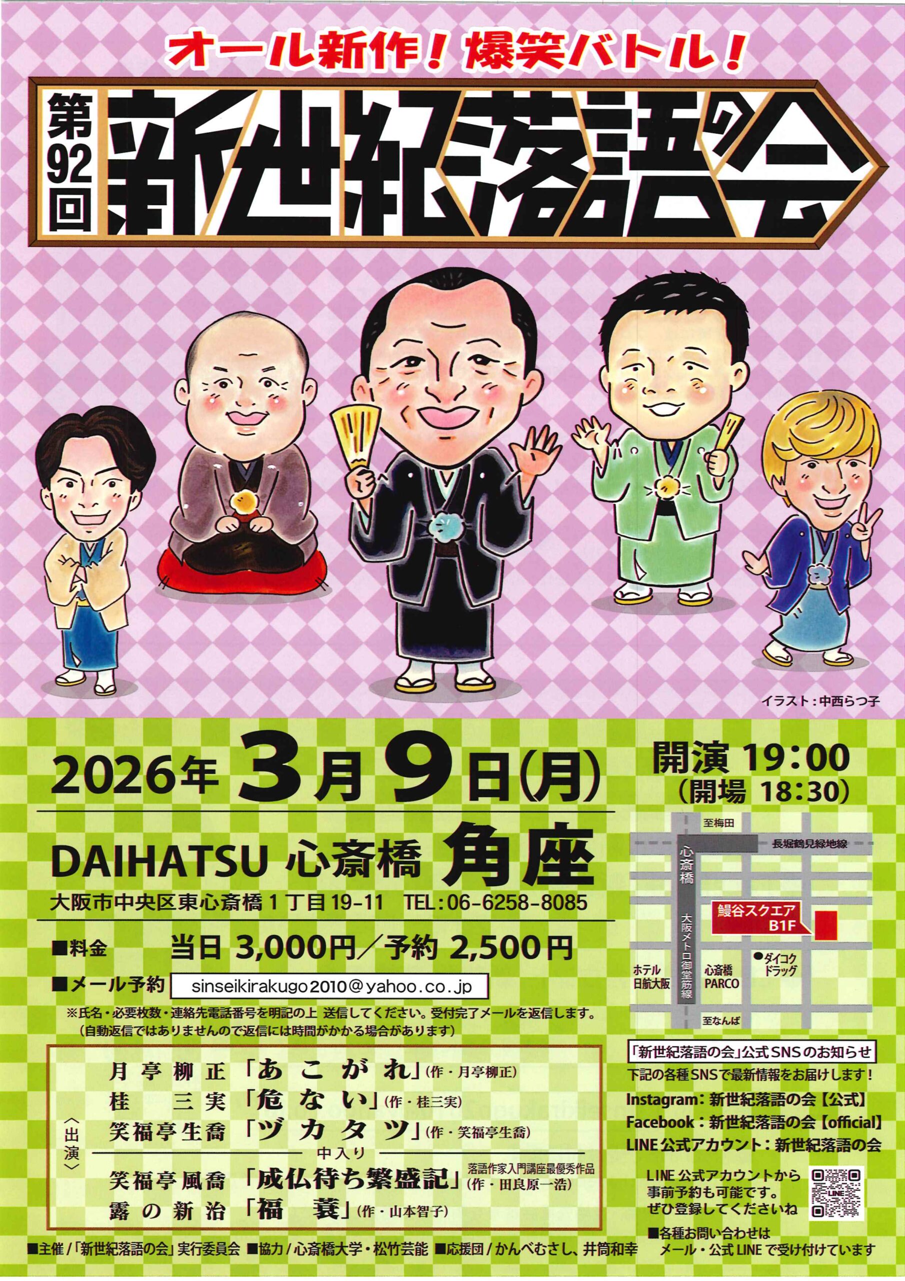 第92回 新世紀落語の会 月亭柳正笑福亭風喬桂三実笑福亭生喬露の新治 access_time 2026.03.09 シェア 送る ツイート 公演概要 公演日時 2026年3月9日(月)19時開演(18時30分開場) 場所 心斎橋 角座(大阪市中央区東心斎橋1丁目19-11) 出演者 月亭 柳正 「あこがれ(作:月亭柳正)」 桂 三実 「危ない(作:桂三実)」 笑福亭 生喬 「ヅカタツ(作:笑福亭生喬)」 中入り 笑福亭 風喬 「成仏待ち繫盛記(作:田良原一浩) 露の 新治 「福蓑(作:山本智子)」 料金 予約 2,500 円 当日 3,000 円 お問い合わせ Mail sinseikirakugo2010@yahoo.co.jp « 前へ一覧へ 次へ » 直近の落語会情報 2026年03月03日 動楽亭 昼席 3月席 桂わかば桂慶治朗桂吉弥桂八十八桂米舞 2026年03月04日 国立文楽劇場寄席 第142回 上方演芸特選会 月亭遊真笑福亭銀瓶 2026年03月04日 第32回 雀五郎と呂好 桂雀五郎笑福亭呂好