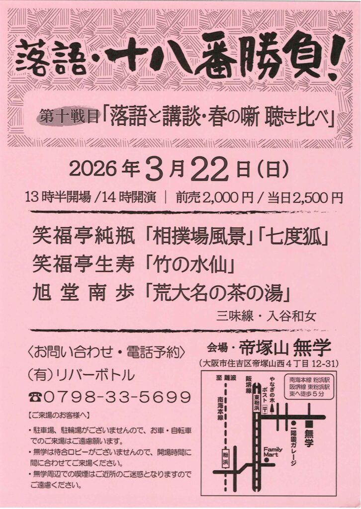 落語・十八番勝負! 笑福亭純瓶笑福亭生寿入谷和女 access_time 2026.03.22 シェア 送る ツイート 公演概要 公演日時 2026年3月22日(日)14時開演(13時30分開場) 場所 帝塚山 無学(大阪市住吉区帝塚山西4丁目12-31) ♢南海本線「粉浜」駅・阪堺線「東粉浜」駅 東へ徒歩5分 出演者 笑福亭 純瓶 「相撲場風景」「七度狐」 笑福亭 生寿 「竹の水仙」 旭堂 南歩 「荒大名の茶の湯」 三味線:入谷 和女 料金 前売 2,000 円 当日 2,500 円 お問い合わせ Tel 0798-33-5699((有)リバーボトル) « 前へ一覧へ 次へ » 直近の落語会情報 2026年03月03日 動楽亭 昼席 3月席 桂わかば桂慶治朗桂吉弥桂八十八桂米舞 2026年03月04日 国立文楽劇場寄席 第142回 上方演芸特選会 月亭遊真笑福亭銀瓶 2026年03月04日 第32回 雀五郎と呂好 桂雀五郎笑福亭呂好