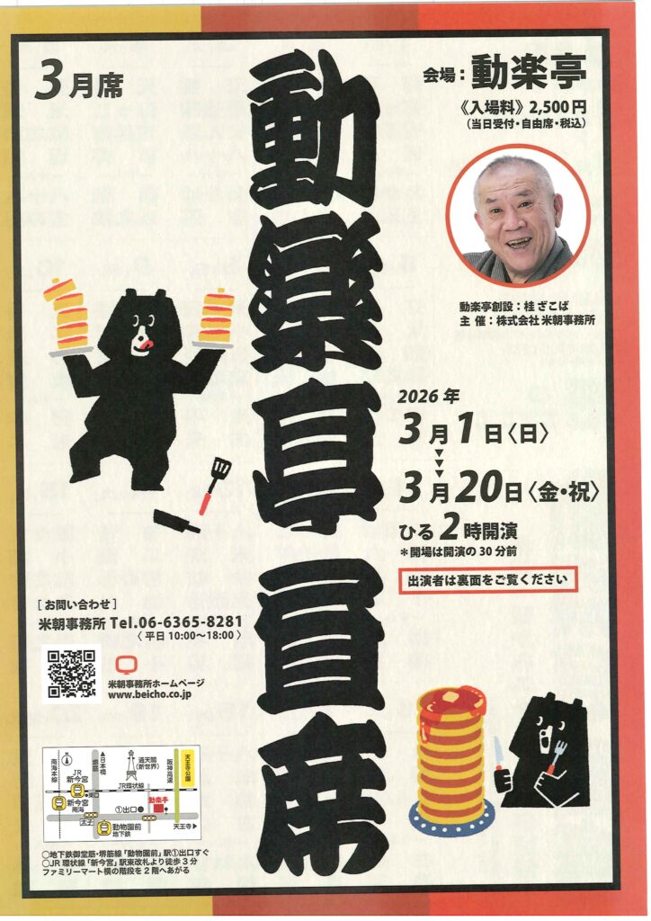 動楽亭 昼席 3月席 桂惣兵衛桂雀三郎桂米左桂慶治朗桂二豆 access_time 2026.03.01 シェア 送る ツイート 公演概要 公演日時 2026年3月2日(月)14時開演(13時30分開場) 場所 動楽亭(大阪市西成区山王1丁目17-6) ♢地下鉄御堂筋線/堺筋線「動物園前」駅①出口すぐ ♢JR「新今宮」駅 東口改札より徒歩3分 ファミリーマート横の階段から2階へあがる 出演者 桂 二豆 桂 慶治朗 桂 惣兵衛 桂 雀三郎 ―中入― 桂 米左 桂 まん我 料金 2,500円(当日受付・自由席) お問い合わせ 米朝事務所 ℡ 06-6365-8281(平日10時~18時) « 前へ一覧へ 次へ » 直近の落語会情報 2026年02月28日 小鯛と呂好の落語をハッスル!キャッスル!ふたり会 桂小鯛笑福亭呂好 2026年02月28日 毎月10日間‼連続講談千鳥亭 笑福亭松五 2026年02月28日 それゆけ!団治郎 Returns 桂団治郎桂八十助
