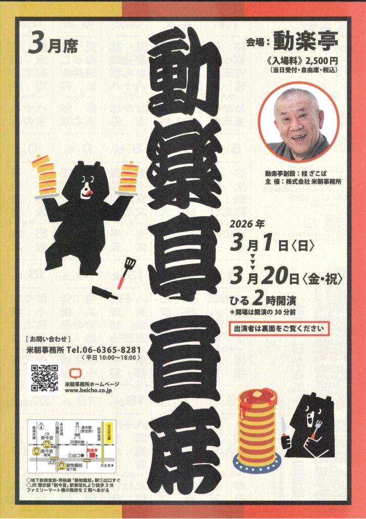 動楽亭 昼席 3月席 桂二豆桂雀喜桂雀五郎桂三語桂慶枝 access_time 2026.03.20 シェア 送る ツイート 公演概要 公演日時 2026年3月20日(金祝)14時開演(13時30分開場) 場所 動楽亭(大阪市西成区山王1丁目17-6) ♢地下鉄御堂筋線/堺筋線「動物園前」駅①出口すぐ ♢JR「新今宮」駅 東口改札より徒歩3分 ファミリーマート横の階段から2階へあがる 出演者 桂 二豆 桂 三語 桂 雀五郎 桂 南天 ―中入― 桂 雀喜 桂 慶枝 料金 2,500円(当日受付・自由席) お問い合わせ 米朝事務所 ℡ 06-6365-8281(平日10時~18時) « 前へ一覧へ 次へ » 直近の落語会情報 2026年03月06日 国立文楽劇場寄席 第142回 上方演芸特選会 月亭遊真笑福亭銀瓶 2026年03月06日 動楽亭 昼席 3月席 桂吉の丞桂歌之助桂鯛蔵桂米輝桂弥壱 2026年03月07日 動楽亭 昼席 3月席 桂団治郎桂小鯛桂りょうば桂力造桂文之助