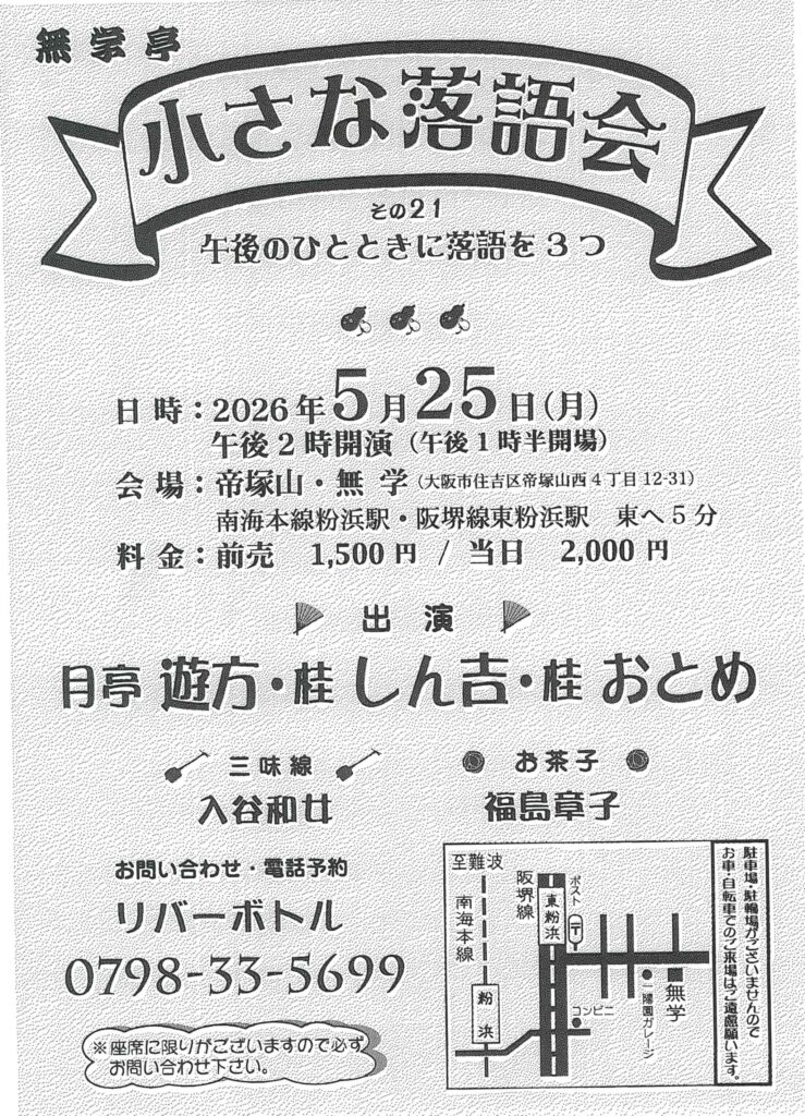 小さな落語会 その21 月亭遊方桂しん吉入谷和女桂おとめ access_time 2026.05.25 シェア 送る ツイート 公演概要 公演日時 2026年5月25日(月)14時開演(13時30分開場) 場所 帝塚山 無学(大阪市住吉区帝塚山西4丁目12-31) ♢南海本線「粉浜」駅・阪堺線「東粉浜」駅 東へ徒歩5分 出演者 月亭 遊方 桂 しん吉 桂 おとめ 三味線:入谷 和女 お茶子:福島 章子 料金 前売 1,500 円 当日 2,000 円 お問い合わせ Tel 0798-33-5699((有)リバーボトル) « 前へ一覧へ 直近の落語会情報 2026年03月03日 動楽亭 昼席 3月席 桂わかば桂慶治朗桂吉弥桂八十八桂米舞 2026年03月04日 国立文楽劇場寄席 第142回 上方演芸特選会 月亭遊真笑福亭銀瓶 2026年03月04日 第32回 雀五郎と呂好 桂雀五郎笑福亭呂好