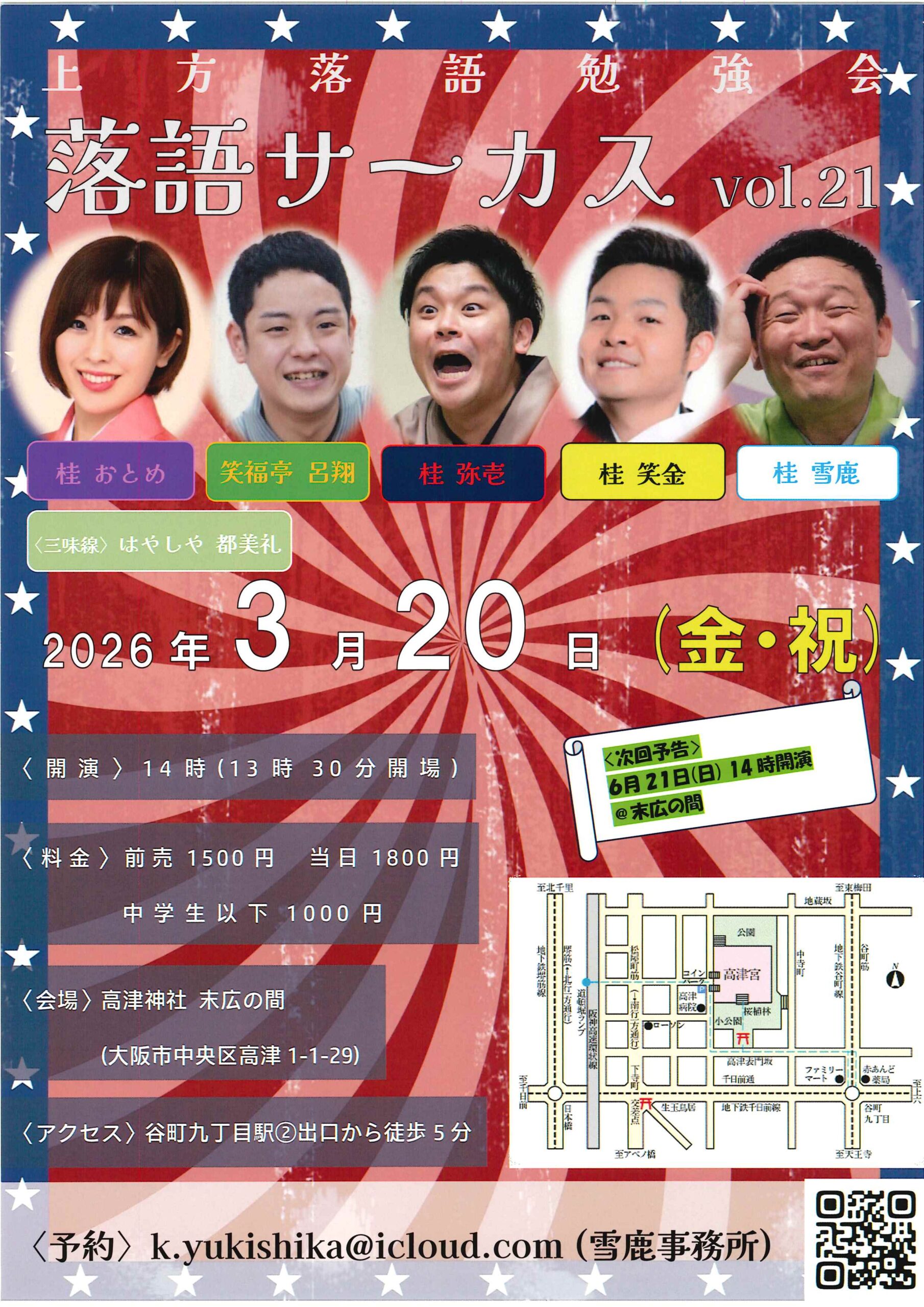 上方落語勉強会 落語サーカス vol.21 桂おとめ桂弥壱桂雪鹿笑福亭呂翔桂笑金 access_time 2026.03.20 シェア 送る ツイート 公演概要 公演日時 2025年3月20日(金・祝)14時開演(13時30分開場) 場所 高津の富亭(大阪市中央区高津1-1-29) ♢「谷町九丁目」駅②出口から徒歩5分 出演者 桂 おとめ 笑福亭 呂翔 桂 弥壱 桂 笑金 桂 雪鹿 三味線:はやしや 都美礼 料金 前売 1,500円 当日 1,800円 中学生以下 1,000 円 お問い合わせ Mail k.yukishika@icloud.com « 前へ一覧へ 次へ » 直近の落語会情報 2026年03月13日 動楽亭 昼席 3月席 桂米団治桂米平桂米輝笑福亭伯枝笑福亭福笑桂八十助 2026年03月13日 第110回 梅田にぎわい亭 桂雀五郎桂源太桂雀太桂雀喜 2026年03月14日 第二百十八回 落語みゅーじあむ寄席 桂おとめ笑福亭三喬桂三語