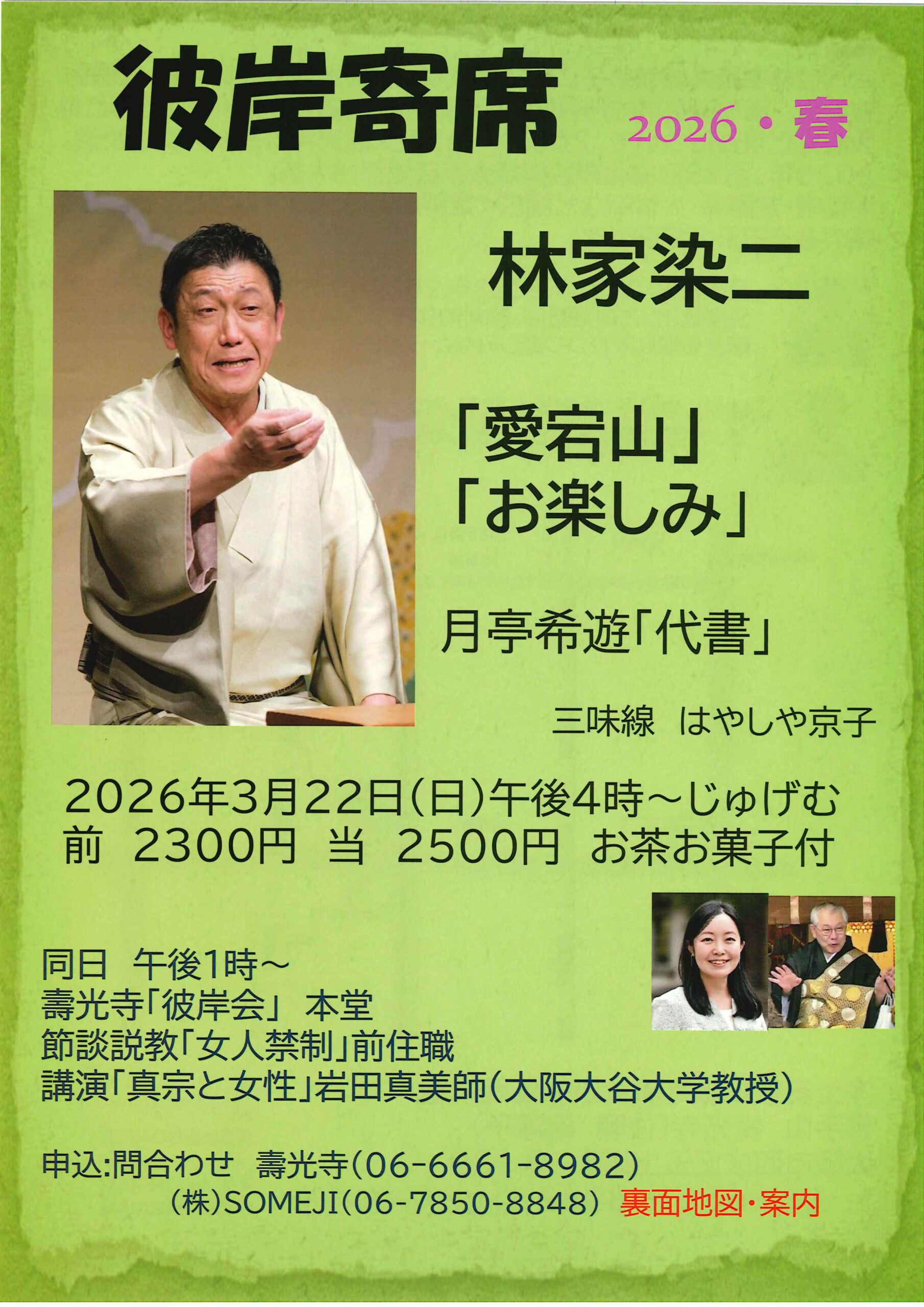 彼岸寄席 林家染二月亭希遊 access_time 2026.03.22 シェア 送る ツイート 公演概要 公演日時 2026年3月22日(日)16時開演(15時30分開場) 場所 壽光寺会館 じゅげむ ♢メトロ四つ橋線「玉出」駅7分・阪堺線「塚西」駅前 出演者 月亭 希遊 「代書」 林家 染二 「お楽しみ」 中入り 林家 染二 「愛宕山」 三味線:はやしや 京子 料金 協力金 2,300 円 (自由・椅子席) お問い合わせ 《㈱SOMEJI 》 ℡ 06-7850-8848 « 前へ一覧へ 次へ » 直近の落語会情報 2026年03月14日 第二百十八回 落語みゅーじあむ寄席 笑福亭三喬桂三語桂おとめ 2026年03月14日 動楽亭 昼席 3月席 桂小枝桂吉の丞桂二乗桂出丸桂春之輔 2026年03月14日 第4回 ふうぷ!落語会 桂雀太桂枝之進