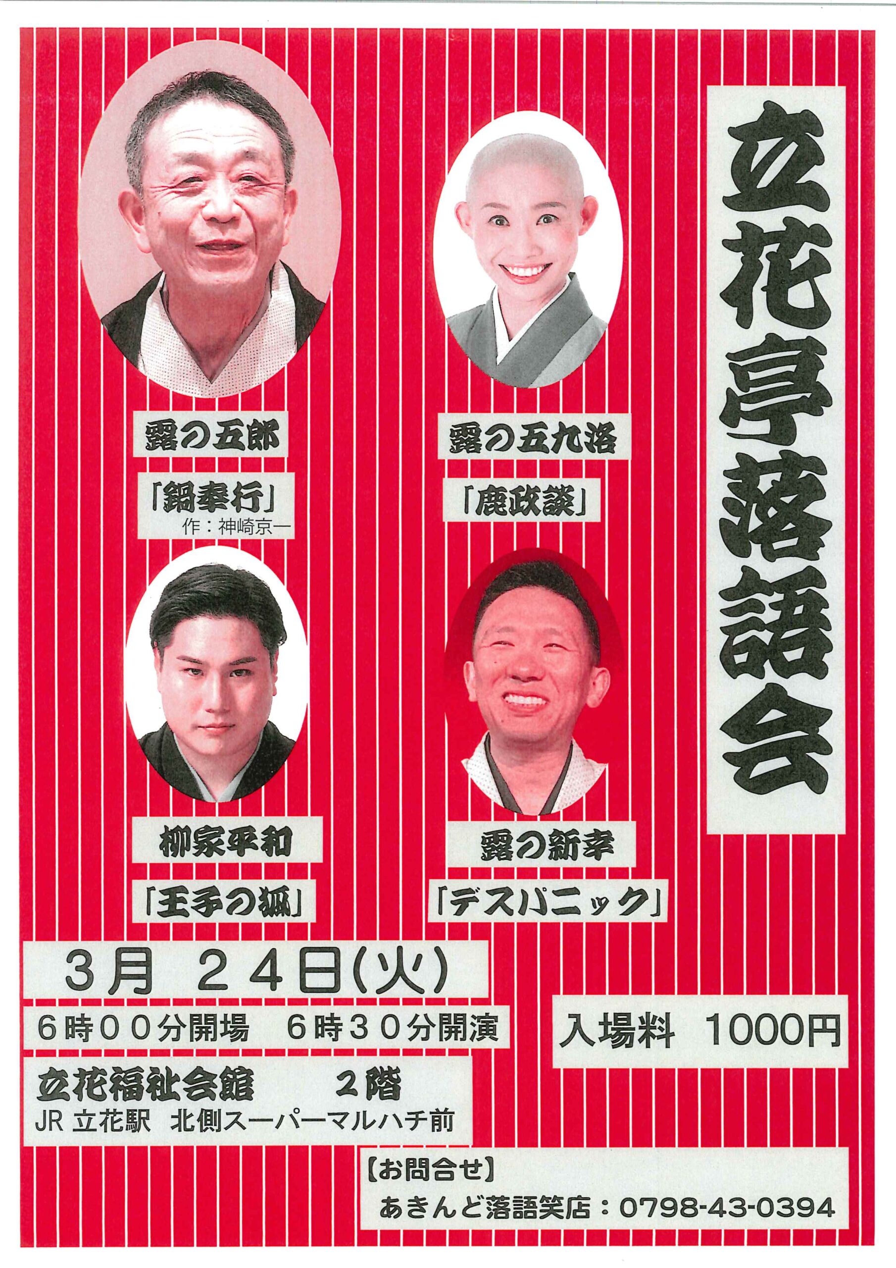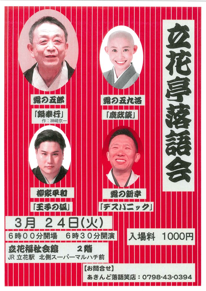 立花亭落語会 露の新幸露の五郎露の 五九洛 access_time 2026.03.24 シェア 送る ツイート 公演概要 公演日時 2026年3月24日(火)18時30分開演(18時開場) 場所 立花福祉会館 2階 ♢JR「立花」駅 北側スーパーマルハチ前 出演者 露の 五郎 「鍋奉行(作:神崎京一)」 露の 五九洛 「鹿政談」 柳家 平和 「王子の狐」 露の 新幸 「デスパニック」 料金 1,000 円 お問い合わせ Tel 0798-43-0394(あきんど落語笑店) « 前へ一覧へ 次へ » 直近の落語会情報 2026年03月13日 動楽亭 昼席 3月席 桂米団治桂米平桂米輝笑福亭伯枝笑福亭福笑桂八十助 2026年03月13日 第110回 梅田にぎわい亭 桂雀太桂雀喜桂雀五郎桂源太 2026年03月14日 第二百十八回 落語みゅーじあむ寄席 笑福亭三喬桂三語桂おとめ
