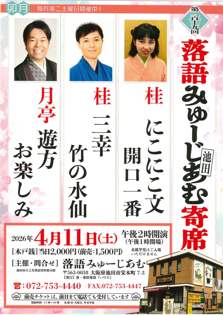 第二百十九回 落語みゅーじあむ寄席 月亭遊方桂三幸 access_time 2026.04.11 シェア 送る ツイート 公演概要 公演日時 2026年4月11日(土)14時開演(13時開場) 場所 落語みゅーじあむ(大阪府池田市栄本町7-3) 出演者 桂 にこにこ文 「開口一番」 桂 三幸 「竹の水仙」 月亭 遊方 「お楽しみ」 料金 前売 2,000 円 当日 1,500 円 お問い合わせ Tel 072-753-4440 Fax 072-753-4447 « 前へ一覧へ 次へ » 直近の落語会情報 2026年03月16日 動楽亭 昼席 3月席 桂米二桂鯛蔵笑福亭右喬桂米舞桂春若桂しん吉 2026年03月17日 動楽亭 昼席 3月席 桂春若桂慶治朗桂米之助桂あさ吉笑福亭右喬桂八十助 2026年03月17日 第42回 九雀家の人々 桂九雀桂九ノ一桂九寿玉岡野鏡