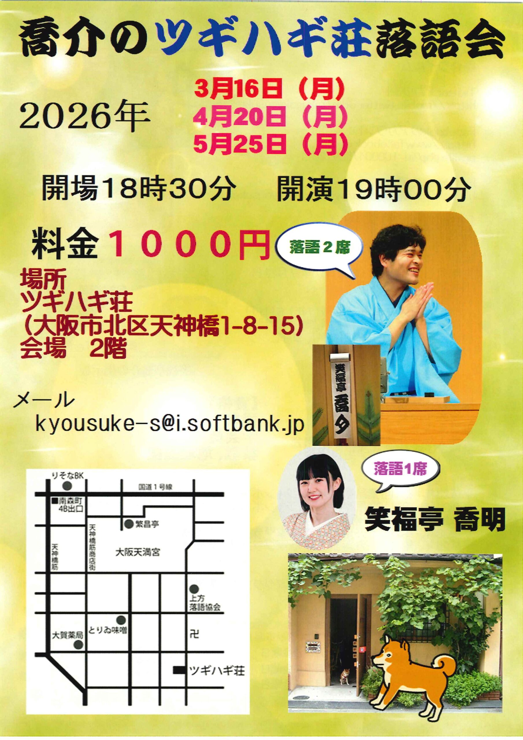 喬介のツギハギ荘落語会 笑福亭喬介笑福亭喬明 access_time 2026.04.20 シェア 送る ツイート 公演概要 公演日時 2026年4月20日(月)19時開演(18時30分開場) 場所 ツギハギ荘(大阪市北区天神橋1-8-15) 出演者 笑福亭 喬介 2席 笑福亭 喬明 1席 料金 料金 1,000 円 お問い合わせ Mail kyousuke-s@i.softbank.jp « 前へ一覧へ 次へ » 直近の落語会情報 2026年03月29日 八十助 ひとつひとつ 桂八十助桂米舞はやしや都美礼 2026年03月29日 第2回 福楽倶楽部 桂福楽 2026年03月29日 第21回 桂雪鹿@ホーム落語会 笑福亭智丸笑福亭竹林桂雪鹿
