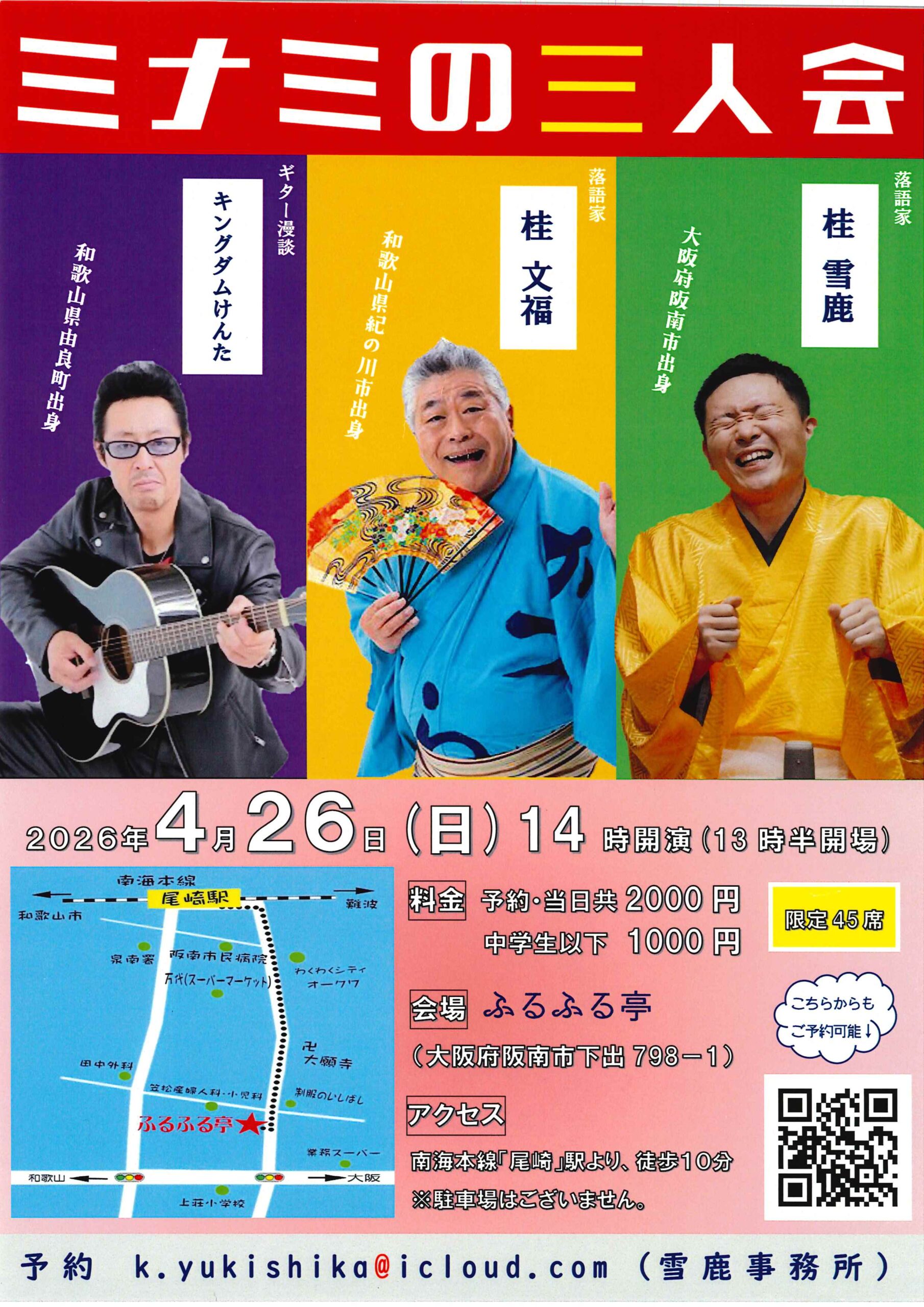 ミナミの三人会 桂文福桂雪鹿 access_time 2026.04.26 シェア 送る ツイート 公演概要 公演日時 2026年4月26日(日)14時開演(13時30分開場) 場所 ふるふる亭(大阪府阪南市下出798-1) ◇南海本線「尾崎」駅より徒歩10分 出演者 桂 雪鹿 桂 文福 キングダムけんた 料金 予約・当日 2000円 中学生以下 1000円 お問い合わせ 《雪鹿事務所》 k.yukishika@icloud.com « 前へ一覧へ 次へ » 直近の落語会情報 2026年04月07日 あべのハルカス寄席 四月席 林家染吉笑福亭生喬桂三歩笑福亭呂好露の新治 2026年04月07日 染左一門 おひるまえ落語会 林家染左 2026年04月08日 あべのでじゃくったれ 桂雀太