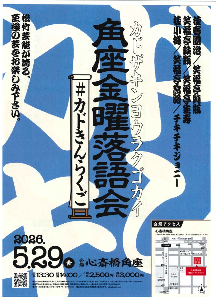 角座金曜落語会 笑福亭鉄瓶笑福亭純瓶桂小梅笑福亭生寿桂春団治笑福亭喬路 access_time 2026.05.29 シェア 送る ツイート 公演概要 公演日時 2026年5月29日(金)14時開演(13時30分開場) 場所 心斎橋角座(大阪市中央区東心斎橋1丁目10-11 鰻谷スクエアB1F) 出演者 桂 春団治 笑福亭 純瓶 笑福亭 鉄瓶 笑福亭 生寿 桂 小梅 笑福亭 喬路 チキチキジョニー 料金 前売 2,500 円 当日 3,000 円 お問い合わせ Tel 06-6258-8085(松竹芸能) « 前へ一覧へ 次へ » 直近の落語会情報 2026年04月04日 第16回 西ノ京寄席 露の眞桂慶枝 2026年04月04日 第40回記念 笑びす寄席 桂阿か枝桂雀太桂春蝶 2026年04月04日 第16回 質屋寄席 月亭遊方笑福亭智丸桂枝曾丸月亭遊真桂八十八