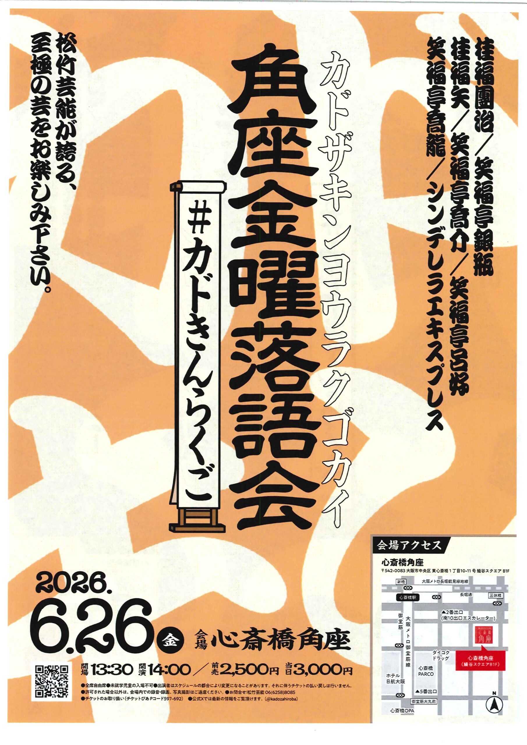角座金曜落語会 桂福矢笑福亭喬介桂福団治笑福亭呂好笑福亭銀瓶笑福亭喬龍 access_time 2026.06.26 シェア 送る ツイート 公演概要 公演日時 2026年6月26日(金)14時開演(13時30分開場) 場所 心斎橋角座(大阪市中央区東心斎橋1丁目10-11 鰻谷スクエアB1F) 出演者 桂 福団治 笑福亭 銀瓶 桂 福矢 笑福亭 喬介 笑福亭 呂好 笑福亭 喬龍 シンデレラエキスプレス 料金 前売 2,500 円 当日 3,000 円 お問い合わせ Tel 06-6258-8085(松竹芸能) « 前へ一覧へ 次へ » 直近の落語会情報 2026年04月04日 第16回 西ノ京寄席 露の眞桂慶枝 2026年04月04日 第40回記念 笑びす寄席 桂阿か枝桂雀太桂春蝶 2026年04月04日 第16回 質屋寄席 桂枝曾丸月亭遊真桂八十八月亭遊方笑福亭智丸