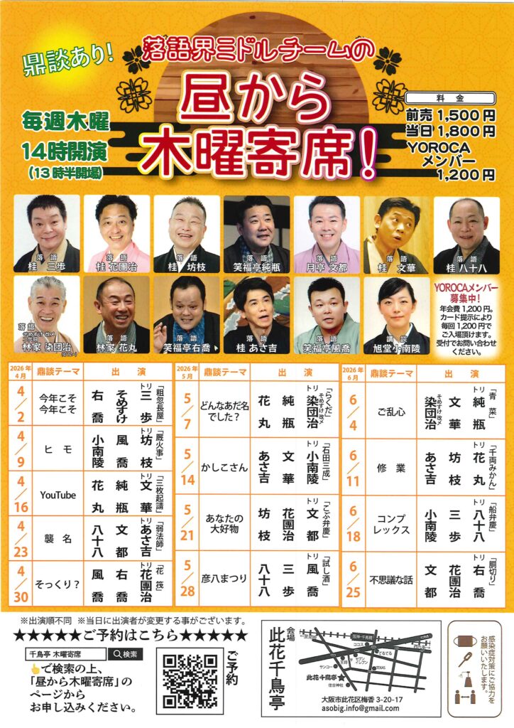 落語会ミドルチームの昼から木曜寄席! 桂八十八笑福亭風喬桂三歩 access_time 2026.05.28 シェア 送る ツイート 公演概要 公演日時 2026年5月28日(木)14時開演(13時30分開場) 場所 此花千鳥亭(大阪市此花区梅花3-20-17) 出演者 桂 八十八 桂 三歩 笑福亭 風喬 「試し酒」 料金 前売 1,500 円 当日 1,800 円 YOROCAメンバー 1,200 円 お問い合わせ Mail asobig.info@gmail.com « 前へ一覧へ 次へ » 直近の落語会情報 2026年04月04日 第16回 西ノ京寄席 露の眞桂慶枝 2026年04月04日 第40回記念 笑びす寄席 桂阿か枝桂雀太桂春蝶 2026年04月04日 第16回 質屋寄席 月亭遊方笑福亭智丸桂枝曾丸月亭遊真桂八十八