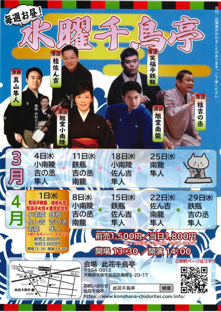 水曜千鳥亭 笑福亭鉄瓶桂吉の丞 access_time 2026.04.29 シェア 送る ツイート 公演概要 公演日時 2026年4月29日(水)14時開演(13時30分開場) 場所 此花千鳥亭(大阪府大阪市此花区梅香3-20-17) 出演者 笑福亭 鉄瓶 桂 吉の丞 真山 隼人 料金 前売 1,500 円 当日 1,800 円 お問い合わせ https://www.konohana-chidoritei.com/info/ « 前へ一覧へ 次へ » 直近の落語会情報 2026年04月05日 第二十五回 紫雲の会 笑福亭生喬露の紫桂健枝郎 2026年04月05日 須磨寺落語会 第二一七回 桂小留笑福亭鶴二桂梅団治花登益子桂米之助 2026年04月05日 無学亭 帝塚山・落語菜Vol.54 由瓶が若手後輩二人に胸を借りる会④ 笑福亭由瓶笑福亭笑利桂九ノ一