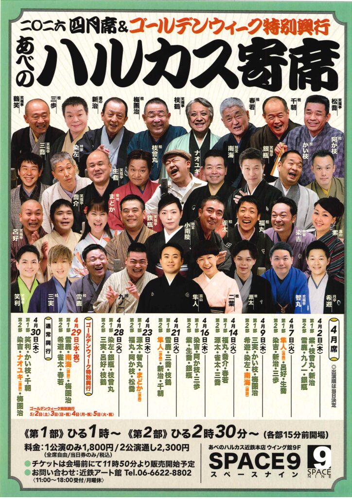 あべのハルカス寄席 四月席 桂かい枝桂三実桂梅団治林家染左月亭希遊旭堂南海 access_time 2026.04.09 シェア 送る ツイート 公演概要 公演日時 2026年4月9日(木)第1部:13時開演(12時45分開場) 第2部:14時30分開演(14時15分開場) 場所 SPACE9(あべのハルカス近鉄本店 ウイング館9階) 出演者 【第1部】 桂 三実 桂 かい枝 桂 梅団治 【第2部】 月亭 希遊 林家 染左 旭堂 南海 料金 当日 1,800 円 2公演通し 2,300 円 ※会場前にて11時50分より販売開始予定 お問い合わせ Tel 06-6622-8802(近鉄アート館) « 前へ一覧へ 次へ » 直近の落語会情報 2026年04月07日 あべのハルカス寄席 四月席 林家染吉笑福亭生喬桂三歩笑福亭呂好露の新治 2026年04月07日 染左一門 おひるまえ落語会 林家染左 2026年04月08日 あべのでじゃくったれ 桂雀太